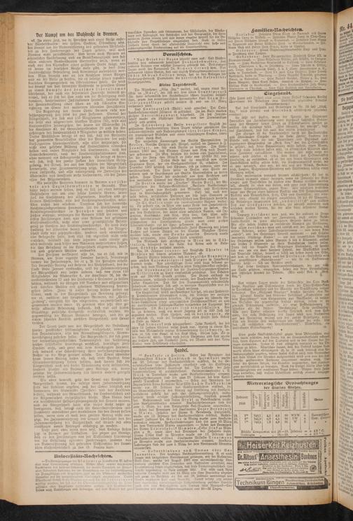 In Schöneberg bei Berlin b er giftete bürslich die I - geschiedene Kaufmannsfrau Anna Degen infolge zerrütteter Fa-1, milienverhältnisse unb Nahrungssorgen ihre beiden Kinder, , ein neunjähriges Vtädchen und einen sechsjährigen Knaben, sowie I sich selber durch Gas. .... „ , -