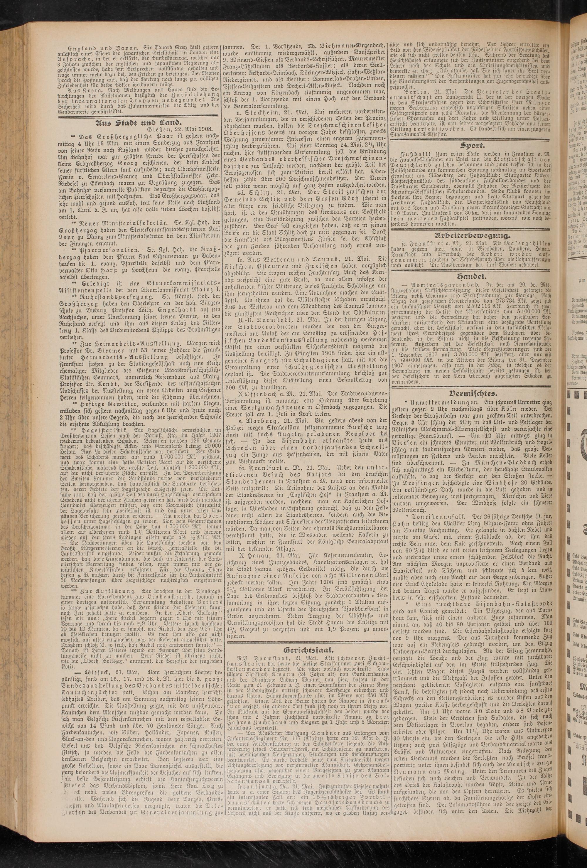 8. Marburg, 21. Mai. Ein gestern abend von-der Polizei wegen Straßenlärm festgenommener Bursche trug einen mit sechs Kugeln geladenen Revolver bei sich. — In der Eisenbahn erkrankte heute aus Schrecken über einen vorbei sau senden Schnellzug ein Junge aus Hassenhausen, der mit seinem Vater zum Viehmarkt wollte.