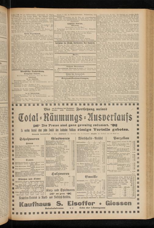 Nächsten Tottnerstag, den 28. Mai, am Hirnrnelsahrltage, finbet außer dem Hauptgoltesdienst in beiden Kirchen noch ein Gottesdienst in der alten Friedhosskapelle Nachinittags 2 Uhr statt.