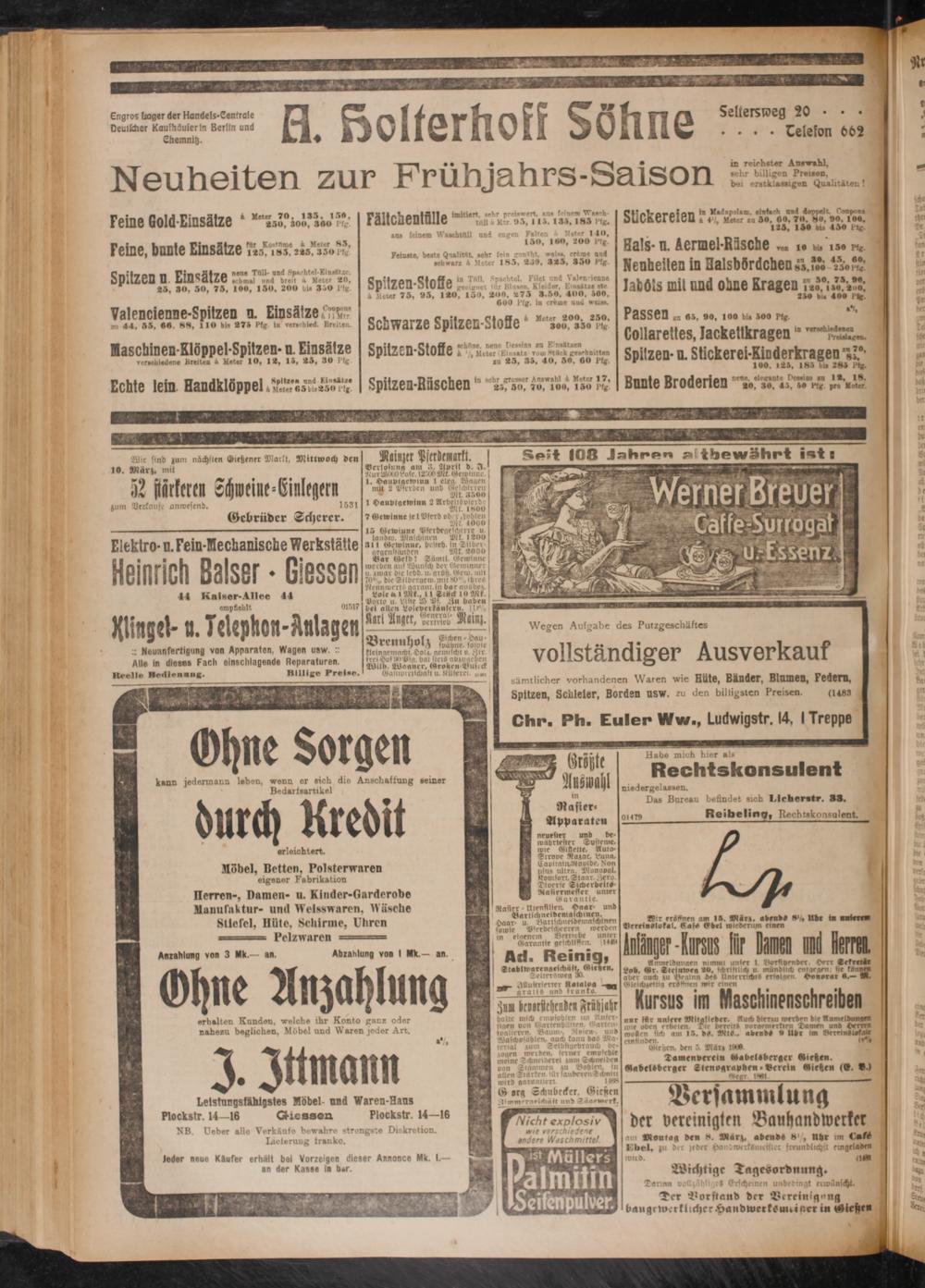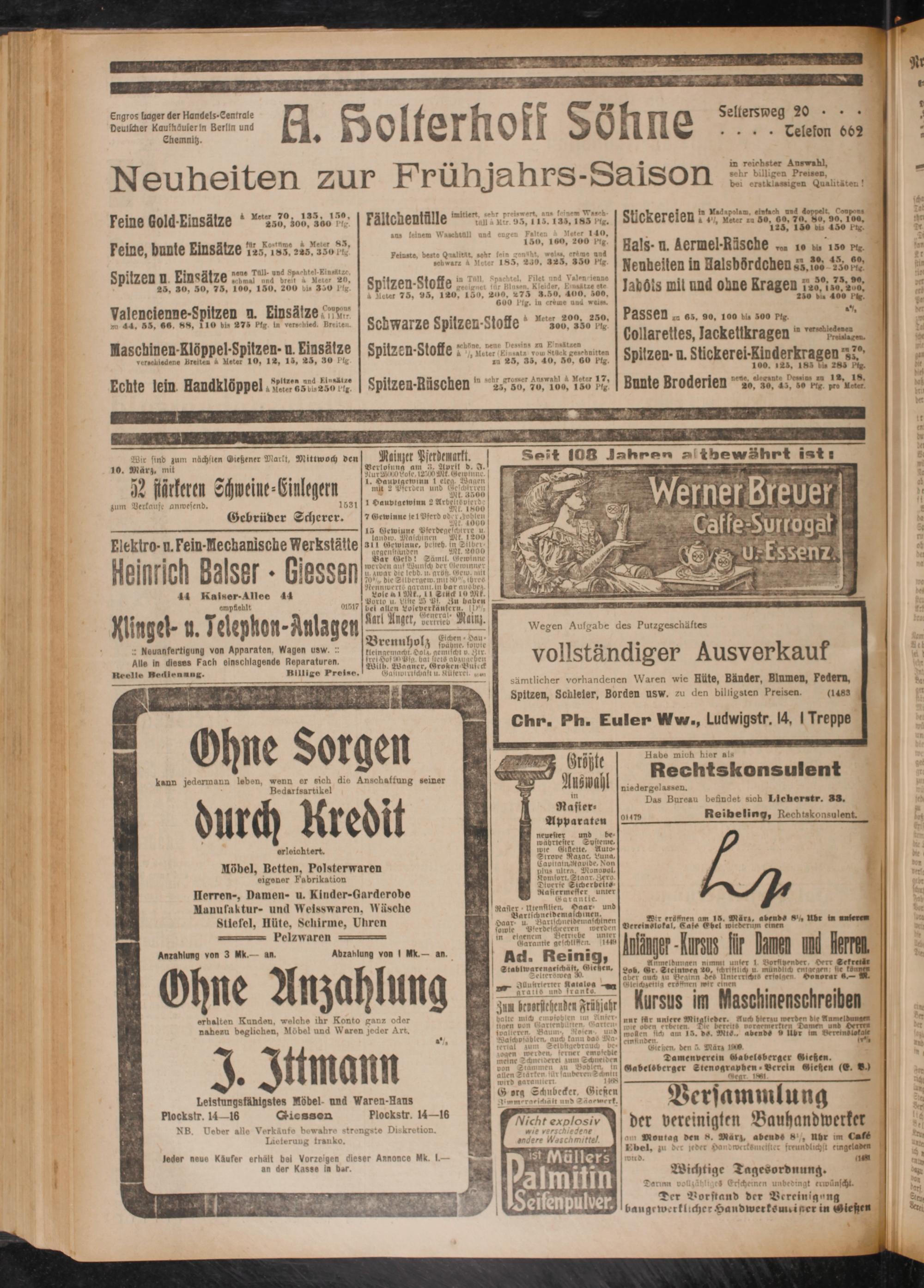 vollständiger Ausverkauf sämtlicher vorhandenen Waren wie Hüte, Bänder, Blumen, Federn, Spitzen, Schieler, Borden USW. zu den billigsten Preisen. (1488