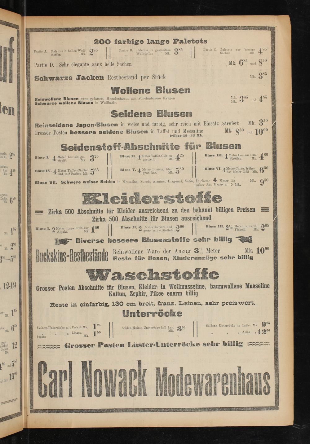Reinseidene Japon-BSusen in weiss und farbig, sehr reich mit Einsatz garniert Mk. dT' Grosser Posten bessere seidene Blusen in Taffet und Messaline Mk. Q50 und 1 aoo