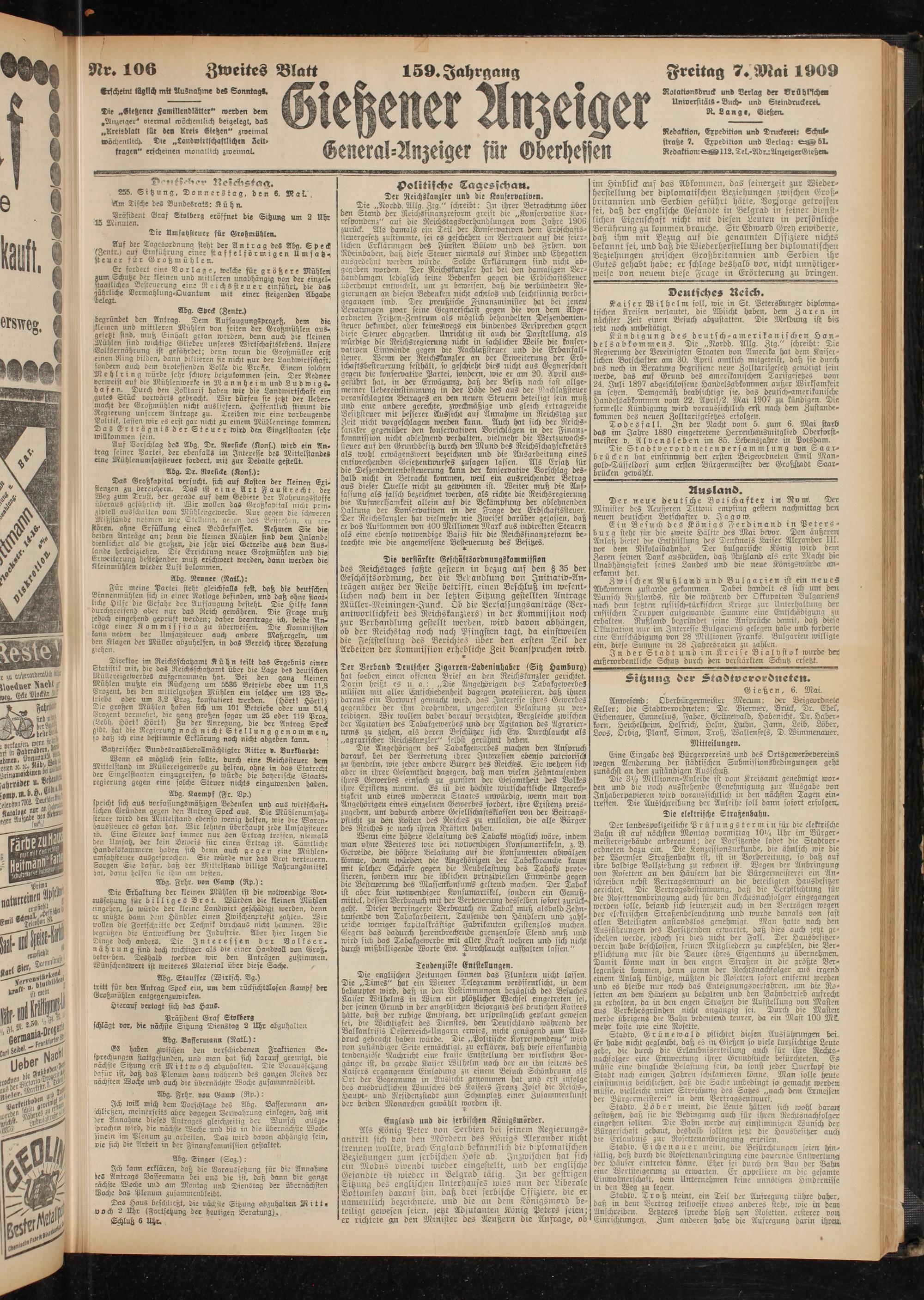 Redaktion, Expedition und Druckerei: Schulstraße 7. Expedition und Verlag: ey® 5L Redaktion:«^ 112. Tel.-AdruAnzergerGießen.
