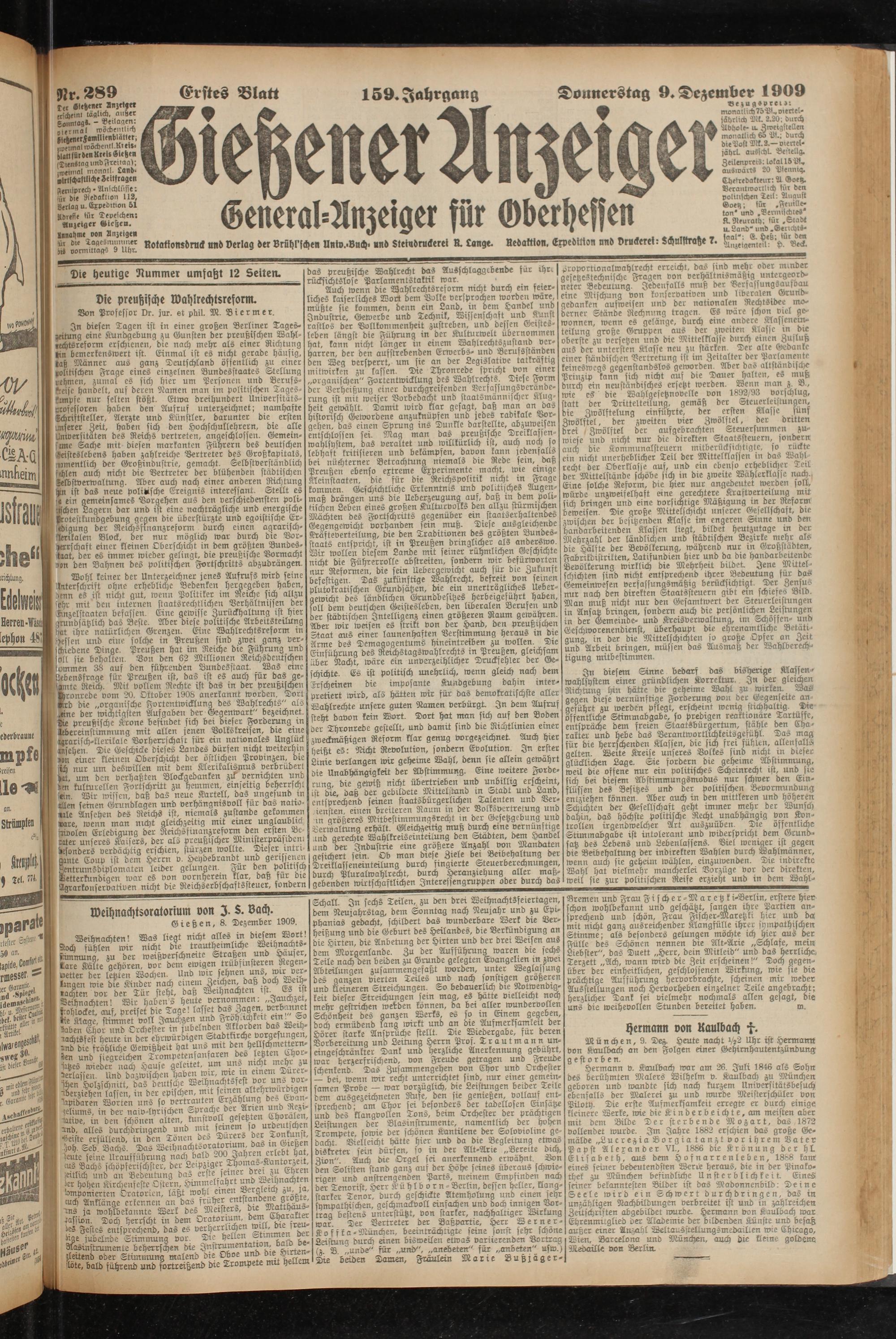 9?r. 289 Erstes Blatt 159. Jahrgang Donnerstag 9. Dezember 1909