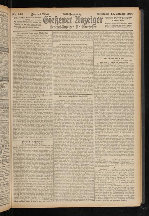 '"Verstorbene hessische Beamte im 3. Vierteljahr 1909: am 10. Aug. Ministerialbuchhalter Rechnungsrat Karl Weisel zu Gießen, am 18. Aug. Lehrer i. P. Karl Bernhard von Großen-Linden zu Darmstadt, am 20. Aug. Förster t. P. Christian Ke iß n er zu Gießen, am 28. Aug. Gendarm i. P. JohS. Blum zu Laubach und am 31. Aug. Arresthausverwalter Hch. Schäfer zu Gießen.