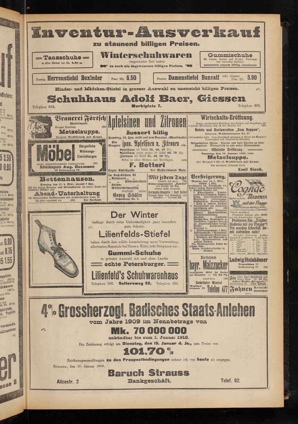 Zeichnungsanmeldungen zu den Prospectbedingungen nehme ich von heute ab entgegen. Giessen, den 15. Januar 1909.
