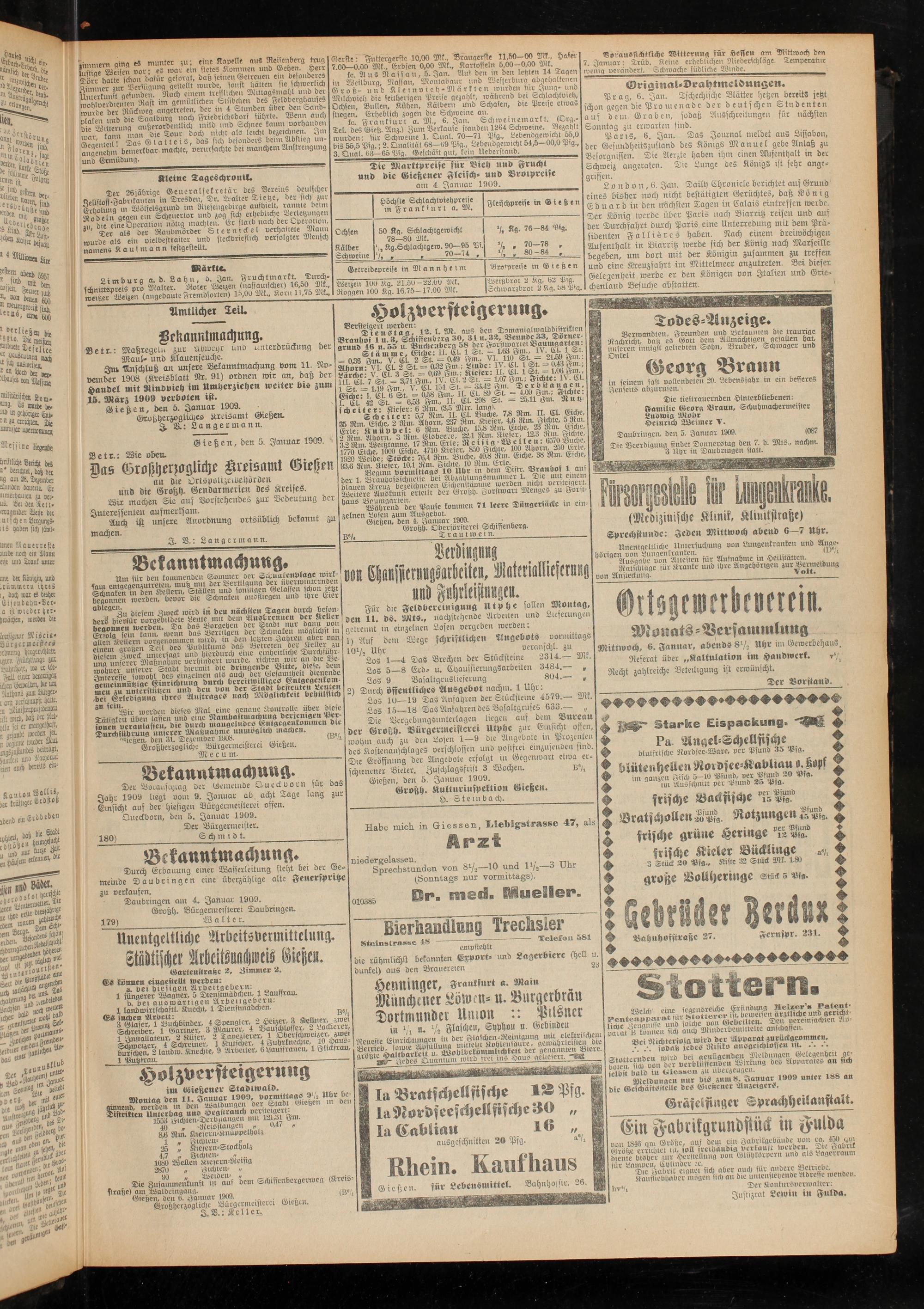 Die Marttpreise für Biell und Frucht und die Gießener Fleisch- und Brorpreisc am 4. Januar 1909.____________