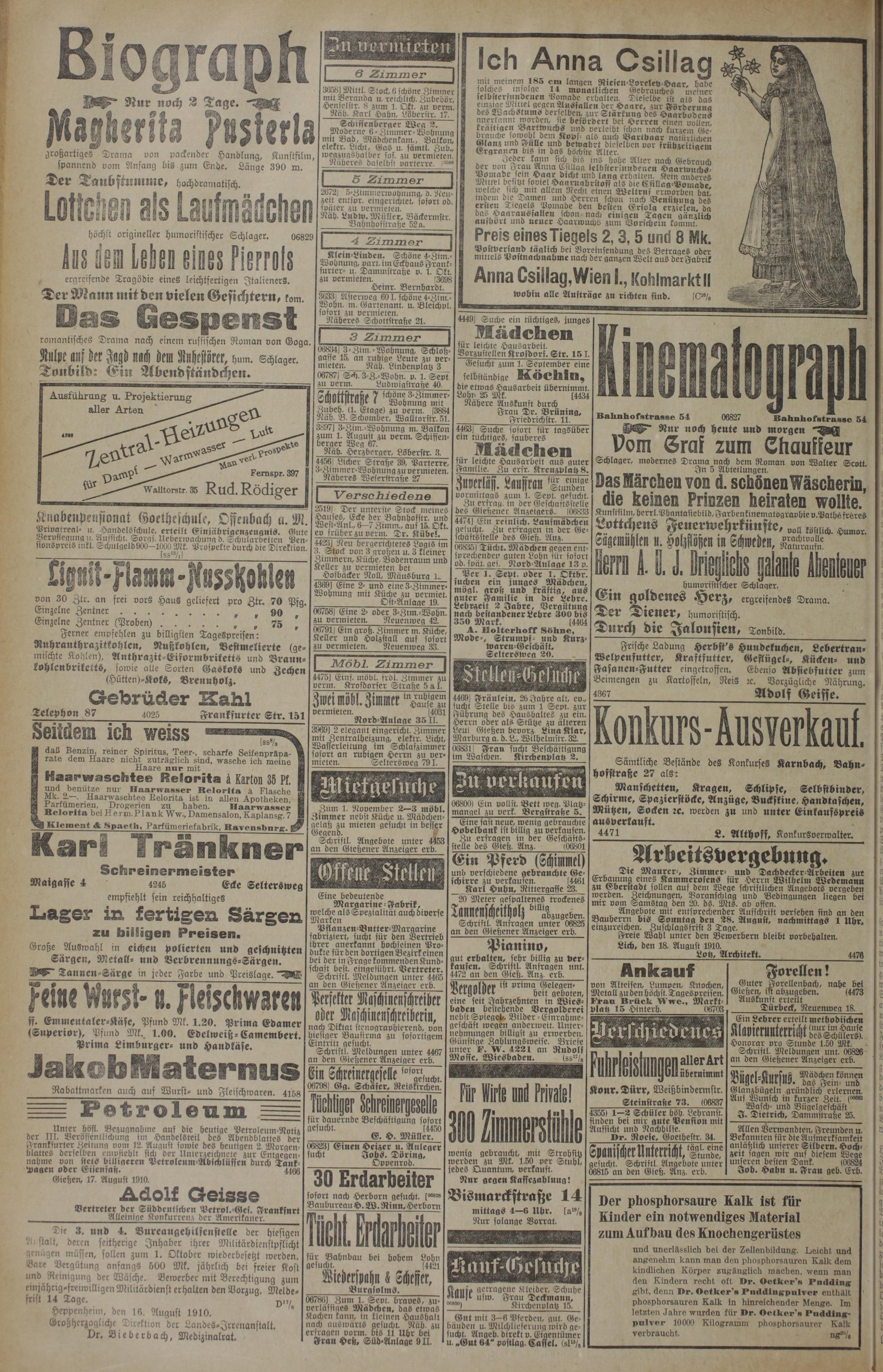 Unter höfl. Bezugnahme auf tue heutige Petroleum-Notiz der III. Veröffentlichung im Handelsteil des Abendblattes der Frankfurter Zeitung vom 12. August sowie des heutigen 2. Morgen- blattes derselben empfiehlt sich der Unterzeichnete zur Entgegennahme von stets billigeren Petroleum-Abschlüssen durch Tankwagen oder Eisensatz. 4466