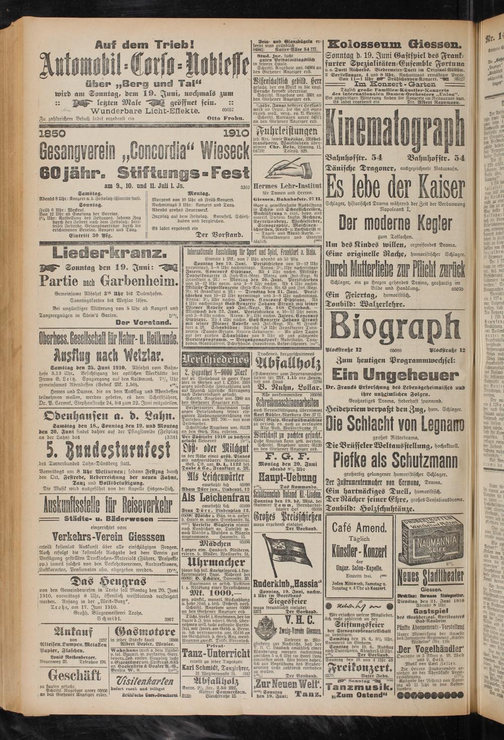 Colosseum Giessen. Sonntag d. 19. Juni Gastspiel des Frankfurter Spezialitäten-Ensemble Fortuna u. a. Duett Richards. Biedermeicr-Duclt im Qrigrual-Küstüm. 2 Vorstellungen, 4 und 8 Ubr. Nachmittags ermäßigte Preise.