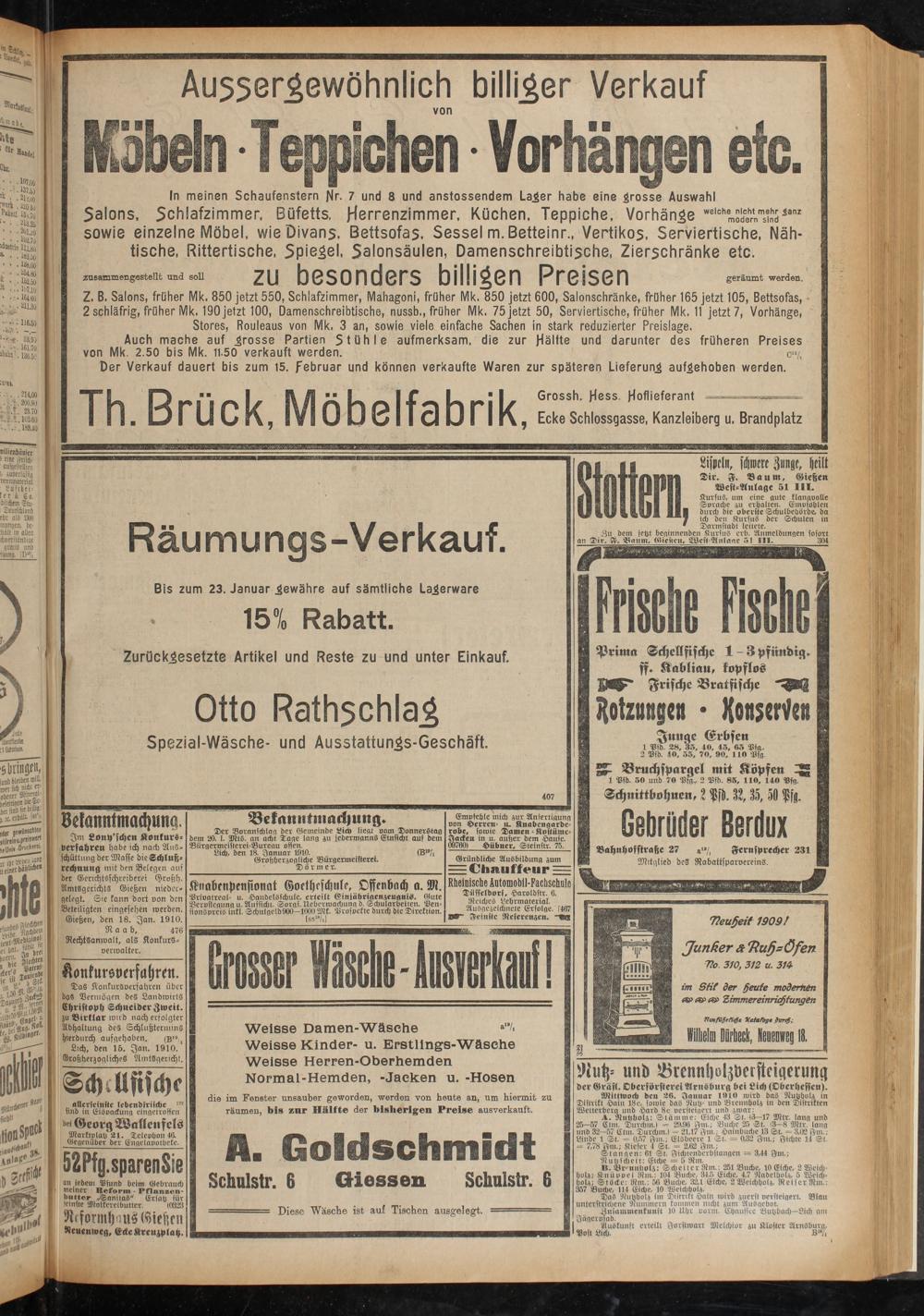 Auch mache auf grosse Partien Stühle aufmerksam, die zur Hälfte und darunter des früheren Preises von Mk. 2.50 bis Mk. 11.50 verkauft werden. ci5/t