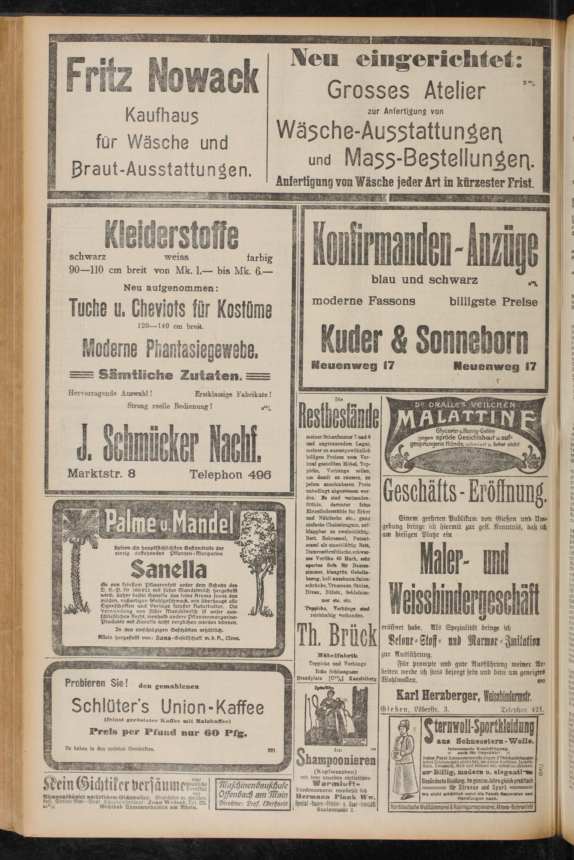 meiner Schaufenster 7 und 8 und angrenzendem Lager, meiner zu aussergewöhnlich billigen Preisen zum Verkauf gestellten Möbel, Teppiche, Vorhänge sollen, um damit za räumen, zu jedem annehmbaren Preis unbedingt abgestossen werden. Es sind vorhanden: Stühle, darunter feine Einzellederstfihle für Erker und Nähtische etc., ganz einfache Chaiselongues, aufklappbar zu zweischläfrig. Bett, Rohrsessel, Patentsessel als einschläfrig. Bett, Damenschreibtische, schwärzet Vertiko 45 Mark, sehr apartes Sofa für Damen- rimmer, blaugrön Gobelinbezug, hell nussbaum Salonschränke, Trumeaus, Säulen, Divan, Büfett, Schlafzim