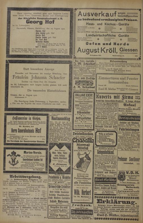 Die Ueberführung nach Giessen findet Donnerstag den 1. September, ’/,ll Uhr vormittags, von Darmstadt, Stiftsstrasse 9, aus statt die Einsegnung x/< Stunde vorher. Die Beisetzung in Giessen erfolgt nachmittags 5*/, Uhr von der Kapelle des alten Friedhofes aus statt. D81/