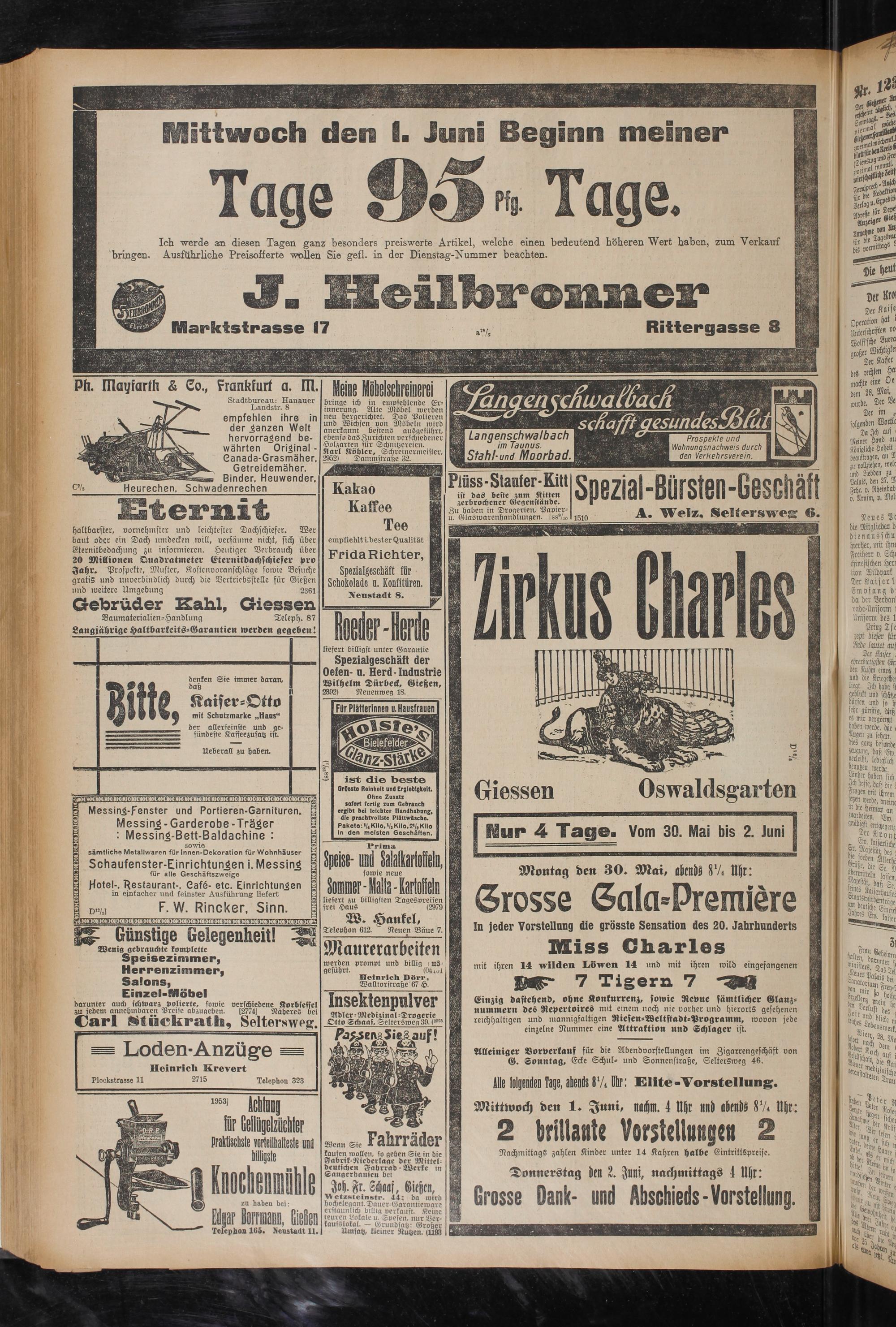 Ich werde an diesen Tagen ganz besonders preiswerte Artikel, welche einen bedeutend höheren Wert haben, zum Verkauf bringen. Ausführliche Preisofferte wollen Sie geil, in der Dienstag-Nummer beachten.