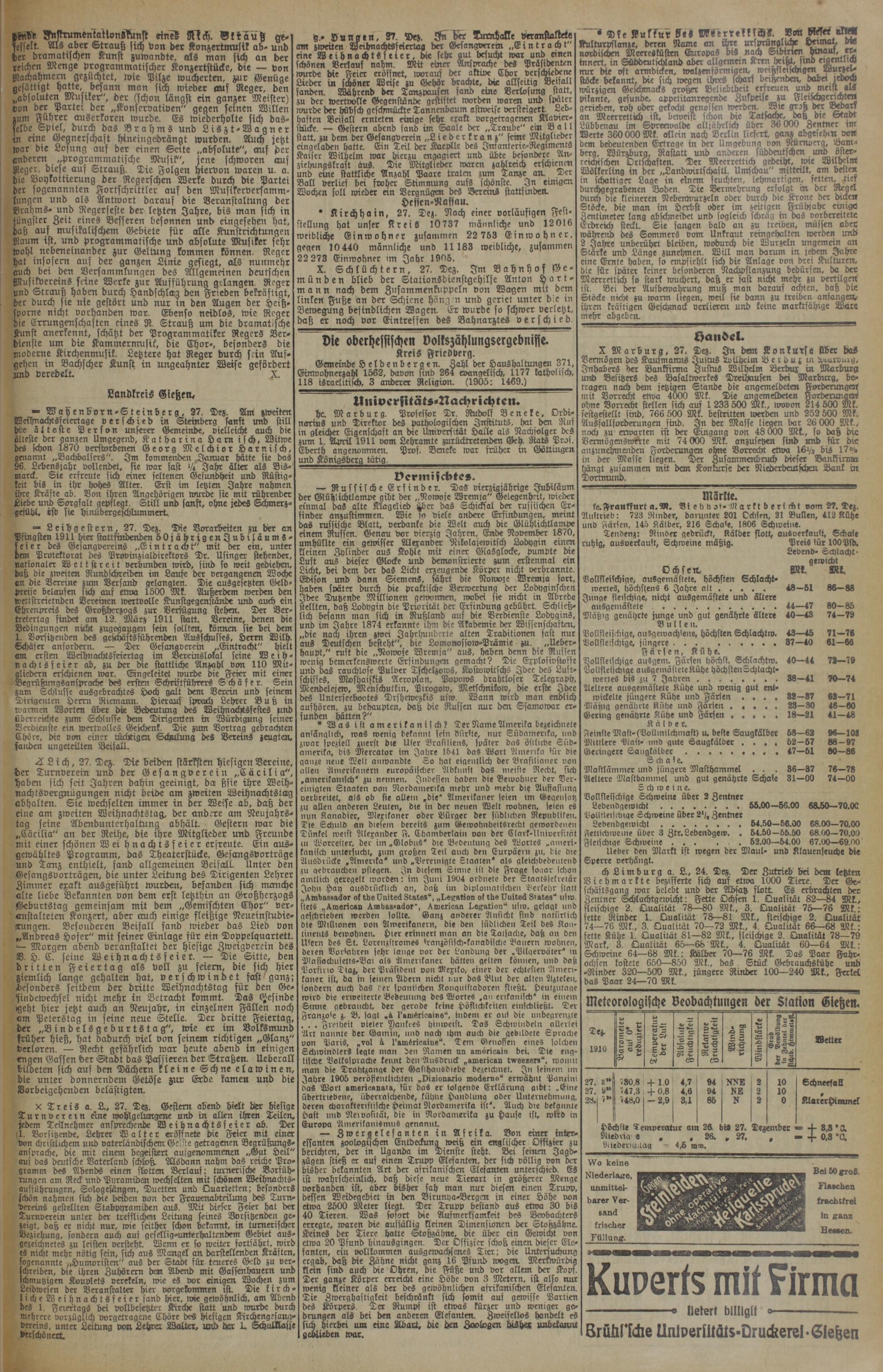 • Kirchhain, 27. Dez. Nach einer vorläufigen Fest- stellung hat unser Kreis 10737 männliche und 12016 weibliche Einwohner zusammen 22 753 Einwo hner, gegen 10 440 männliche und 11183 weibliche, zusammen 22 273 Einwohner im Jahr 1905.