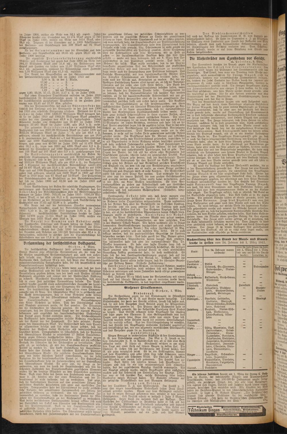 Die fortschrittliche Volkspartei hielt gestern nachmittag in Steins Garten eine öffentliche Versammlung ab, die trotz der für Giessen ungünstigen Versammlungszeit gut, auch von außerhalb besucht war. Nach einigen Begrüßungsworten teilte der Vorsitzende Geh. Justizrat Metz mit, daß heute eine Vertrauensmännerversammlung stattgefunden habe, die sich hauptsächlich mit Organisattonsfragen beschäftigt habe.