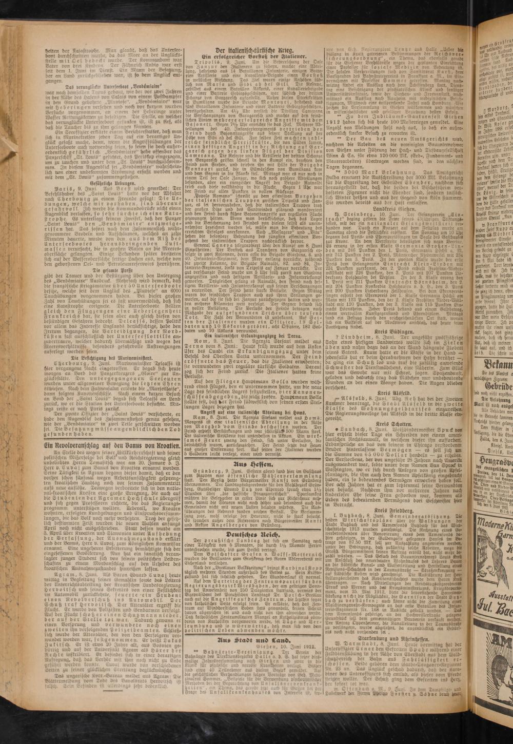 Rom, 9. Juni. Die Agenzia Stefani meldet aus Derna vom 8. Juni: Heute früh wurde auf dem linken User des Ouadi ein Erkundiguugszug unter dem Befehl des Obersten Satta unternommen. Der Feind eröffnete das Feuer, das die Italiener erwiderten; sie verwundeten zwei reguläre türkische Soldaten. Darauf zog sich der Feind zurück. Die Italiener hatten keine Verluste.