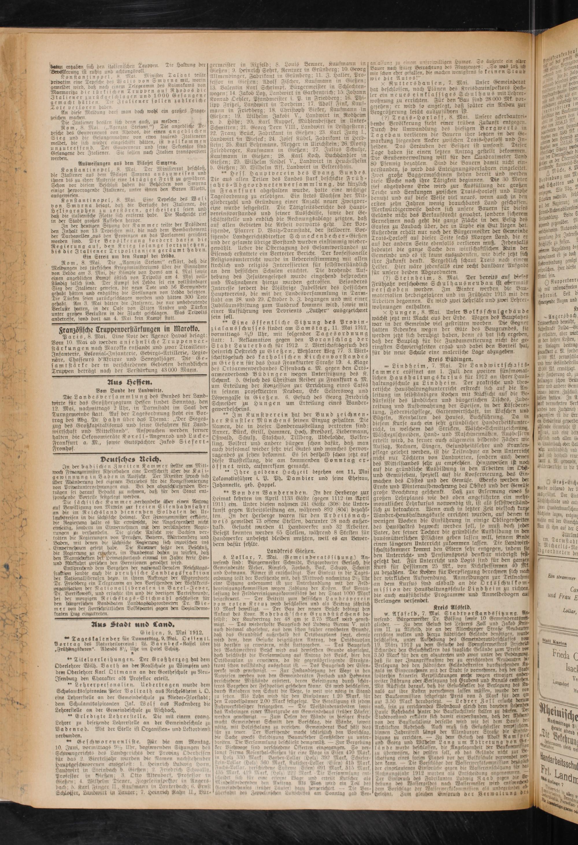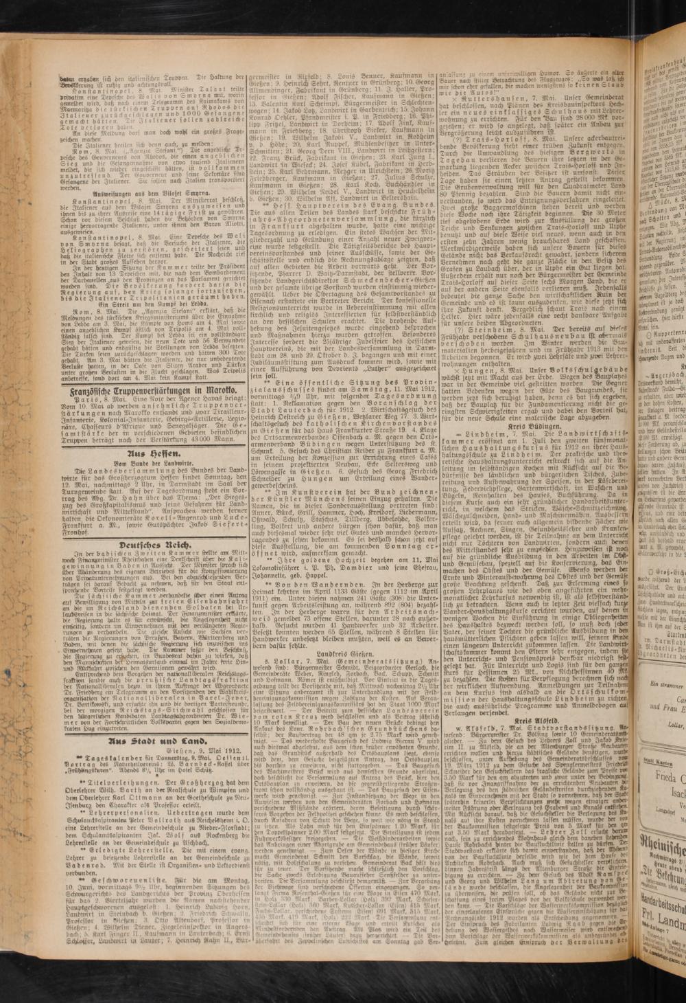 ** Eine öffentliche Sitzung des Provin- zialausfchusses findet am Samstag, 11. Mai 1912, vormittags 3/49 Uhr, mit folgender Tagesordnung statt: 1. Reklamation gegen den Voranschlag der Stadt Lauterbach für 1912. 2. Wirtschaftsgesuch des Heinrich Oestreich zu Gießen, Wetzlarer Weg 77. 3. Wirt- schaftsg^such des katholischen Kirchenvorstandes zu Gießen für das 5>aus Frankfurter Straße 19. 4. Klage des OrtSarmenverbandes Offenbach a. M. gegen den Orts- armenverband Büdingen wegen Unterstützung des K. Schunk. 5. Gesuch des Christian Reiber zu Frankfurt a. M. um Erteilung der Konzession zur Errichtung eines Cafss in seinem projektterten Neubau, Ecke Seltersweg und Löwengasse in Gießen. 6. Gesuch des Georg Friedrich Schneioer zu Hungen um Erteilung eines Wander-