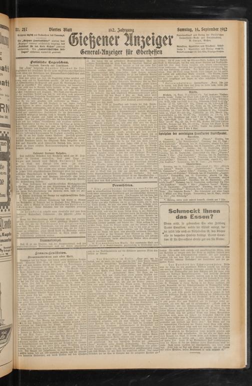 Di« „Otetzener §«m,lle,dIiNer'. werden dem ,tln|rifler“ viermal wöchentlich beigelegt, da« „Krdsblatt fir den Kreis Gießen" zweimal wöchentlich. Tie landwirtschaftliche« idt- fragen" erfchemen monatlich zweimal.