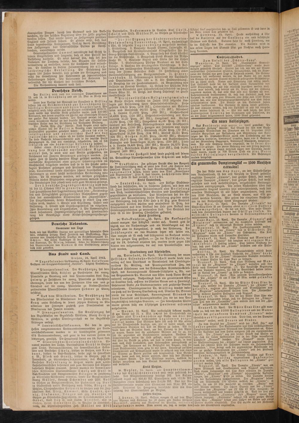 In der Nähe von Kap Race, an ber Südost-Spitze von 'Neufundland, ist der erst kürzlich in Dienst gestellte englische Dampfer „Titanie", das größte Schiff, das wohl .englische Dampfer „Titanic", das gröpte Schiff, das wohl ro Lauterbach, 15. April. Der hiesige Skadtvor- gestoßen und nach mehrstündigen, vergeblichen Rettungsstand hat beschlossen, wie in früheren Jahren, mit dem am versuchen untergegangen. Die ersten Nachrichten über das 12. Juni stattfindenden Prämienmarkt eine Verlosung grauenvolle Unglück lauteten sehr widersprechend, nach den von Vieh, landwirtschaftlichen Geräten und Haushaltungs- neuesten Meldungen ist als sicher anzunehmen, daß von gegenständen zu verbinden. Das Ministerium hat die Er- ben 2200 Menschen, die an Bord waren, nur 67o ge- laubnis zur Veranstaltung dieser Verlosung gegeben unter rettet werden konnten. Wir geben die einzelnen Nachrich- ver Bedingung, daß bis 8000 Lose ä 60 P,g. zum Vertrieb ^n in der Reihenfolge ihres Einganges wieder: ausgegeben werden dürfen und mindestens 55 Proz. des $ap Race, 15. April. Der Dampfer „Titanic" der Vefferung. 4. öh,u|c uhu . mxattoerlöses aus dem Verkauf der Lose zum Ankauf von White-Rica-Linie ist am Sonntag abend m i t einem Eisbe r g