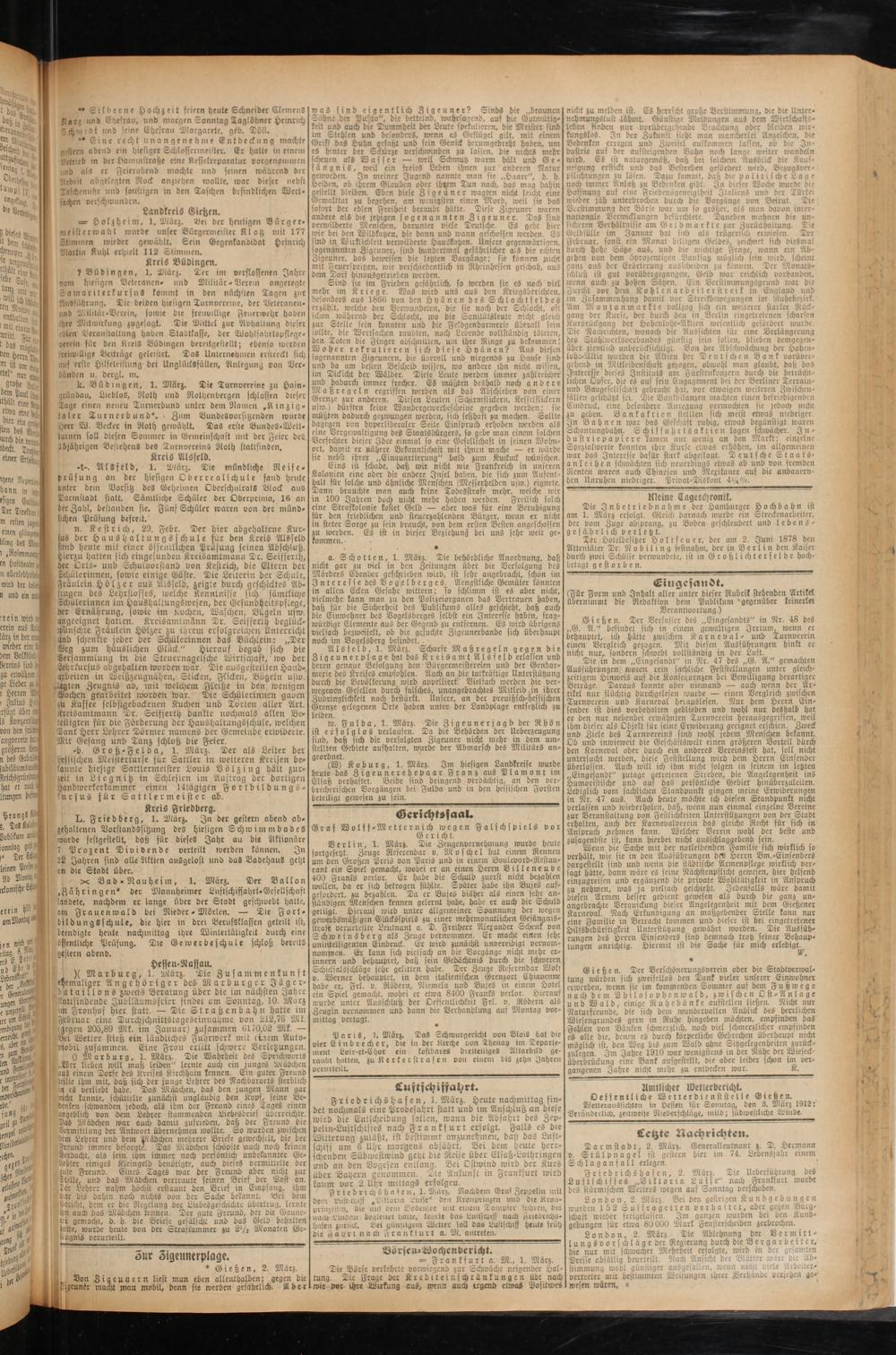 Welteranssichteii in Hessen für Sonntag, den 3. März 1912: Veränderlich, zeilweife Niederschläge, mild; südwestliche Winde.