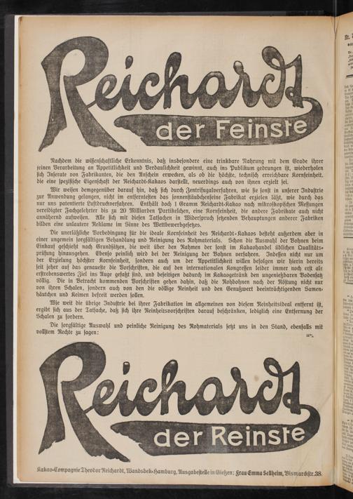 Wir weisen demgegenüber darauf hin, daß sich durch Zentrifugalverfahren, wie sie sonst in unserer Industrie zur Anwendung gelangen, nicht im entferntesten das sonnenstäubchenseine Fabrikat erzielen läßt, wie durch das nur uns patentierte Luftdruckverfahren. Enthält doch 1 Gramm Reichardt-Kakao nach mikroskopischen Mefiungen vereidigter Fachgelehrter bis zu 20 Milliarden Partikelchen, eine Kornfeinheit, die andere Fabrikate auch nicht annähernd aufweisen. Alle sich mit diesen Tatsachen in Widerspruch setzenden Behauptungen anderer Fabriken bilden eine unlautere Reklame im Sinne des Wettbewerbgesetzes.