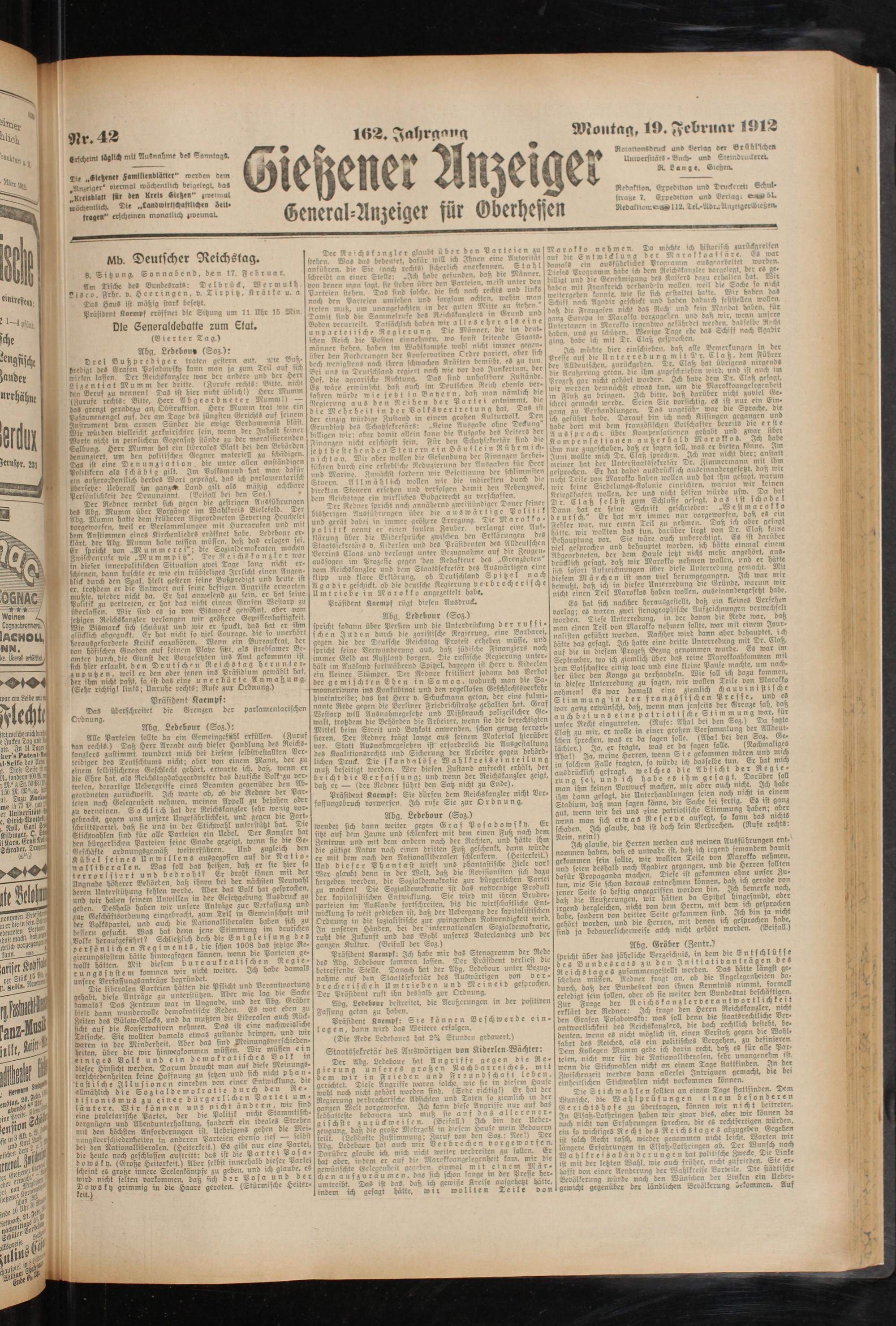 Ter Redner spricht nach annähernd zweistündiger Dauer seiner bisherigen Ausführungen über die auswärtige Politik und gerät dabei in immer größere Erregung Die Marokko- Politik nennt er einen faulen Zauber verlangt eine Auf- llärung über die Widersprüche zwischen den Erklärungen des StaatSsekreläiS v. Kiderlen und des Präsidenten des Alldcutsa;en Vereins Claas und verlangt unter Bezugnahme auf bic Zeugen- auSsageu im Prozesse gegen den Redakteur des ..Grenzboten vom Rkickskanzler und dem Staatssekretär des Auswärtigen eine flipp und klare Erklärung, ob Deutschland Spitzel buch Agadir geschickt, ob die deutsche Regierung verbrecherische Umtriebe in Marokko angezettelt habe.