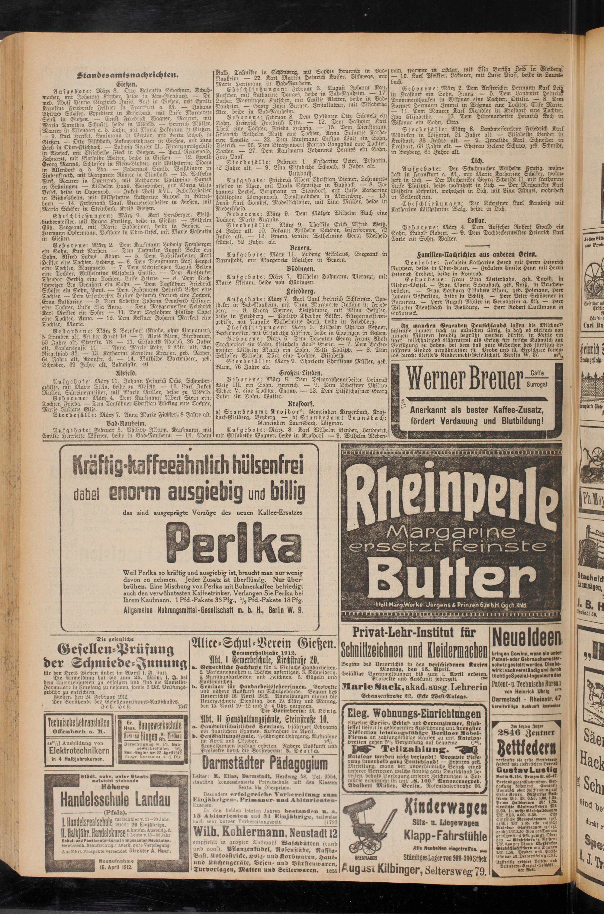 Geborene: März 6. Dem Dozenten Georg Franz Adolf Stachowiack ein Sohn, Reinhold Adolf Erwin. — 7. Dem Bäckermeister Wilhelm Meuth ein Sohn, Willi Philipp. — 8. Dem Schlosser Wilhelm Dörr eine Tochter, Elisabeths