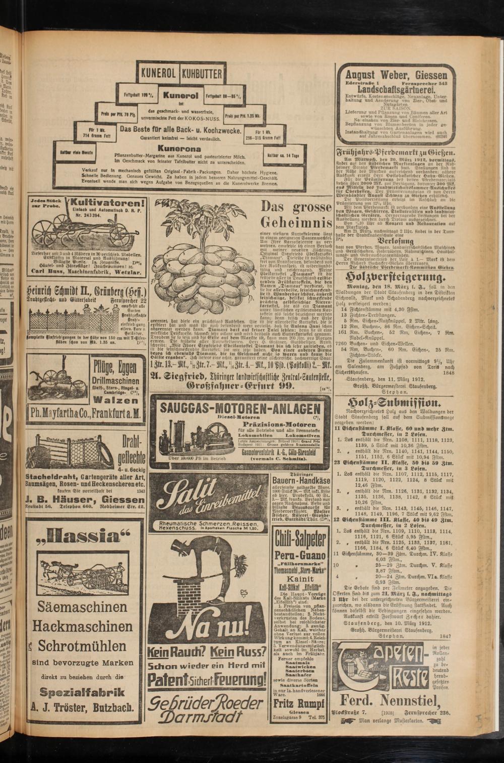 Offerten sind bis zum 21. März L I., nachmittags 3 Uhr bei der unterzeichneten Bürgermeisterei einzureichen, wo alsdann die Eröffnung stattsindet. Auch önnen daselbst die Bedingungen eingesehen werden. Auskunft erteilt Forstwart Zecher dahier. Staufenberg, den 10. März 1912.