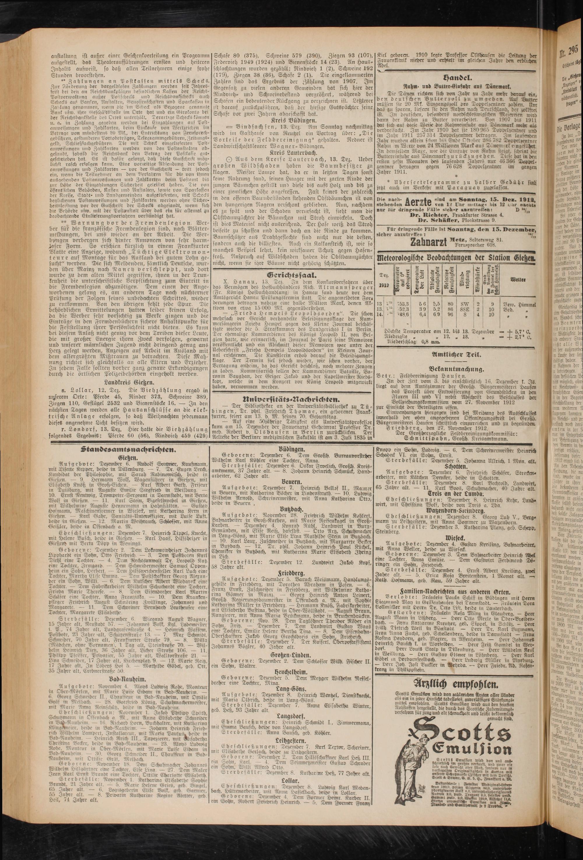 Aufgebote: Dezember 6. Rudolf Sonnicr, Kaufmann, mit Äisette Kepper, beide in Dillenburg. — 7. Tr. Eugen Lerch, Kandidat der Philosophie, mit Sarah Rabinowitsch, beide in Gießen. — 9. Hermann Wolf, Wagenführer in Gießen, mit Elisabeth Knöß in Groß-Eichen. — Karl Albert Gath, Friseur in Duisburg, mit Auguste Emilie Siegfried in Weilburg. — 10. Ernst Nentwig, Trompeter Sergeant in Darmstadt, mit Berta Wolf in Gießen. — 11. Karl Stein, Vizefeldwebel in Gießen, mit Wilhelmine Auguste Henncmann in Hahnstätten. — Gustav Hofmann, Maschinenformer in Wicseck, mit Katharina Kern in Gießen. - - Karl Galrr, Sanitäts-Unteroffizier, mit Luise Luft, beide in Gießen. — 12. Martin Weihrauch, Schlosser, mit 9lnna Geißler, beide in Offenbach a. M.