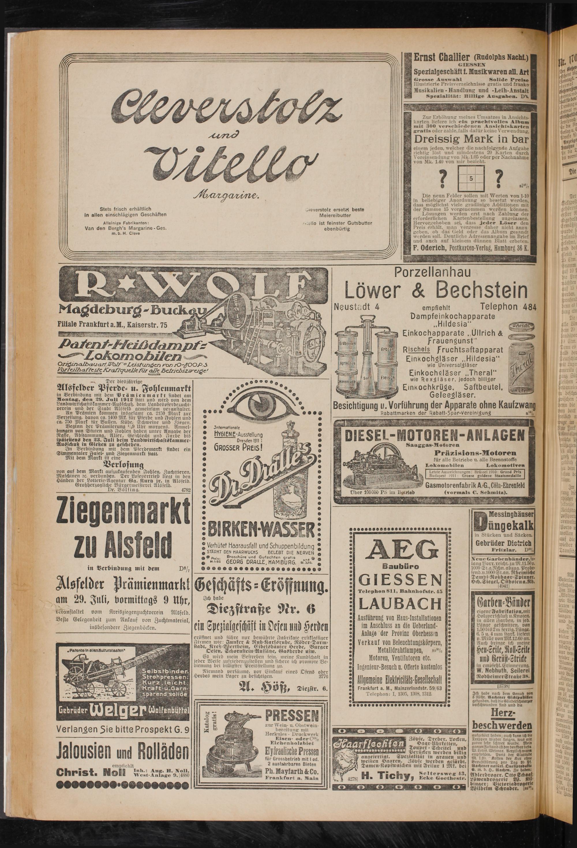 von aus dem Markt aufzukausenden Fohlen, Zuchttieren, Maschinen rc. verbunden. Der Losevertrieb liegt in den Händen der Lotterie-Agentur 6>n. Kurtr jr. in Alsfeld. Groftherzogliche Bürgermeisterei Alsfeld.