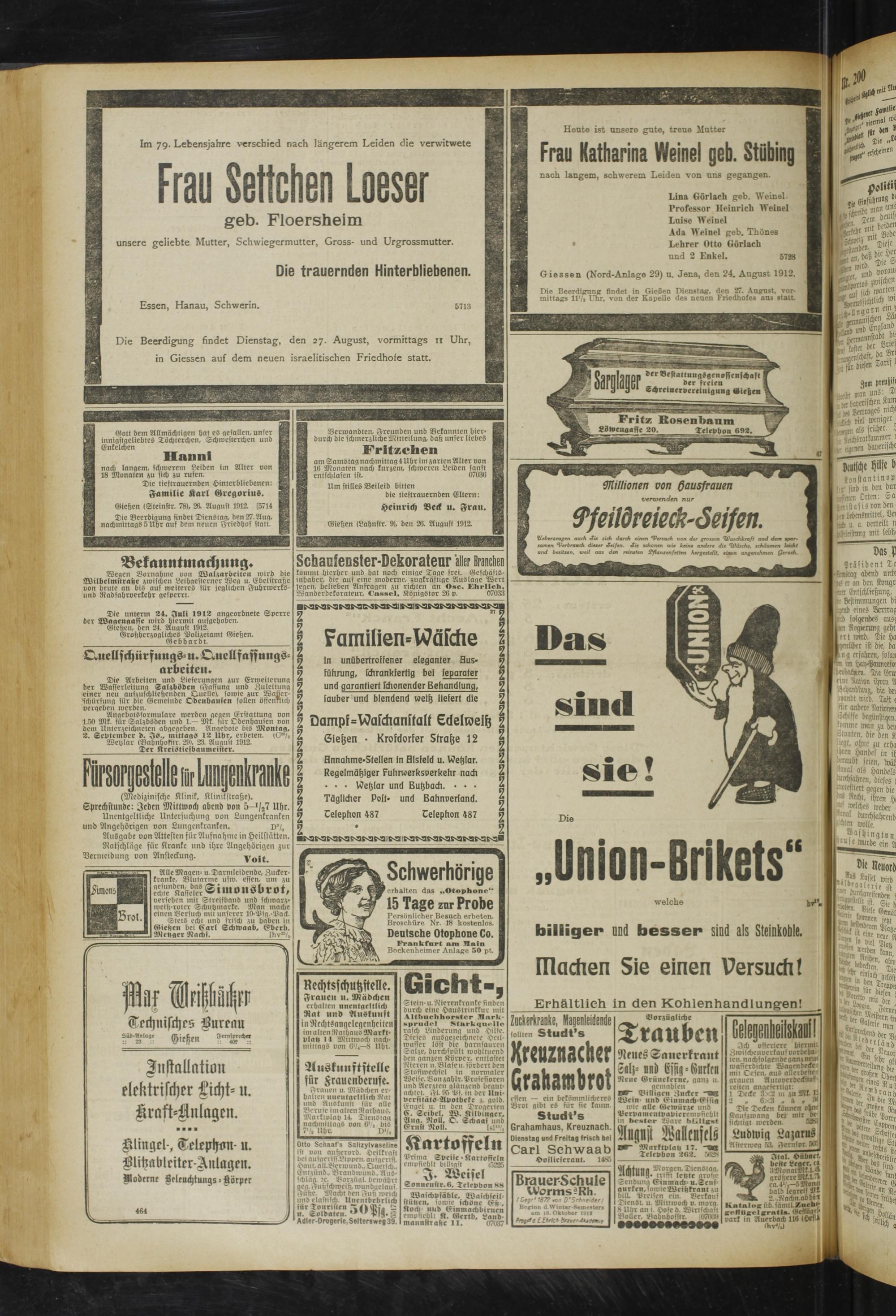 Die Beerdigung findet Dienstag, den 27. August, vormittags 11 Uhr, in Giessen auf dem neuen israelitischen Friedhöfe statt.