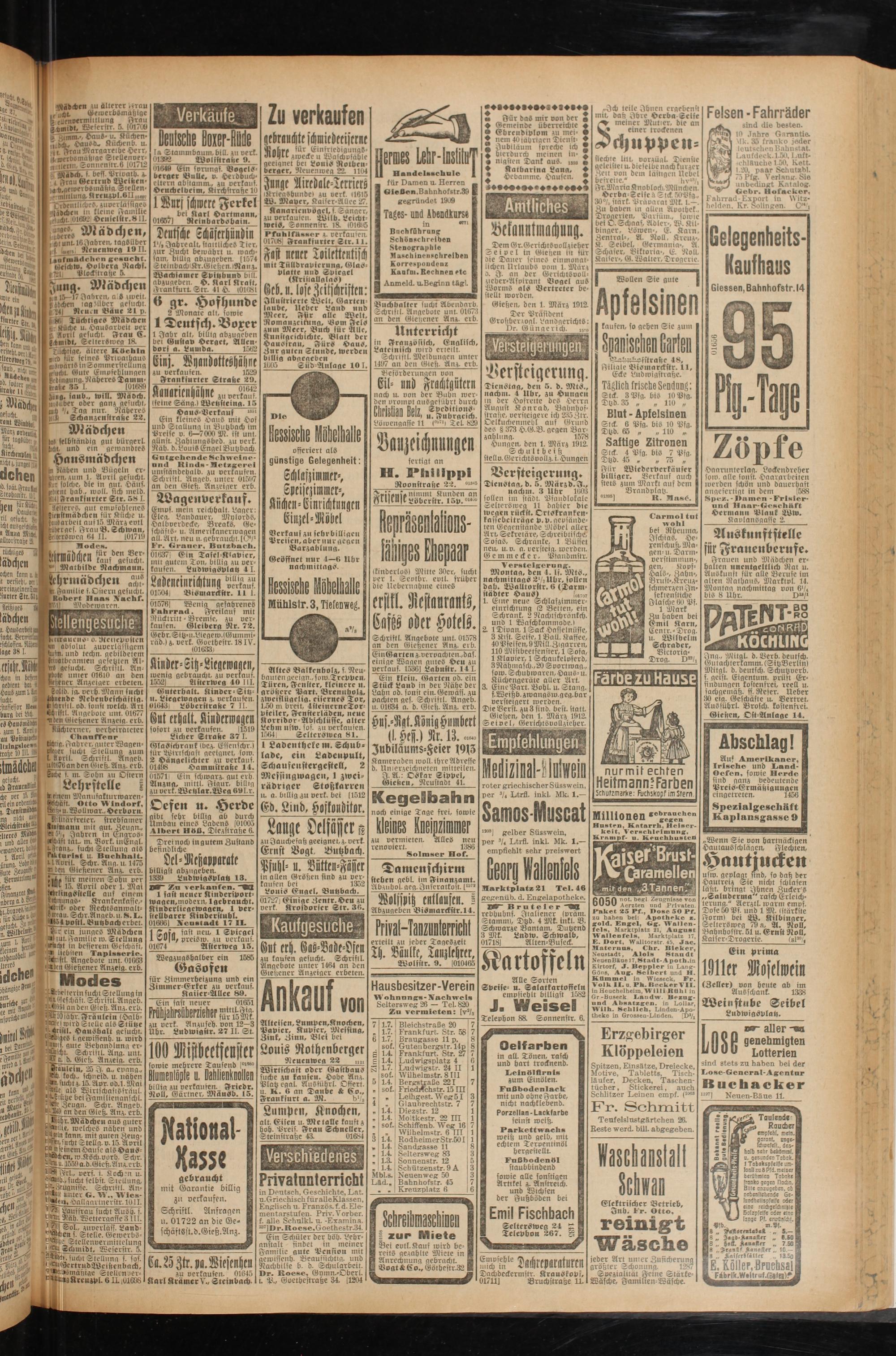 Die Berst. zu 3 sinb. best. statt. Giesien, den 1. März 1912. Seivel, Gerichtsvollzieher.