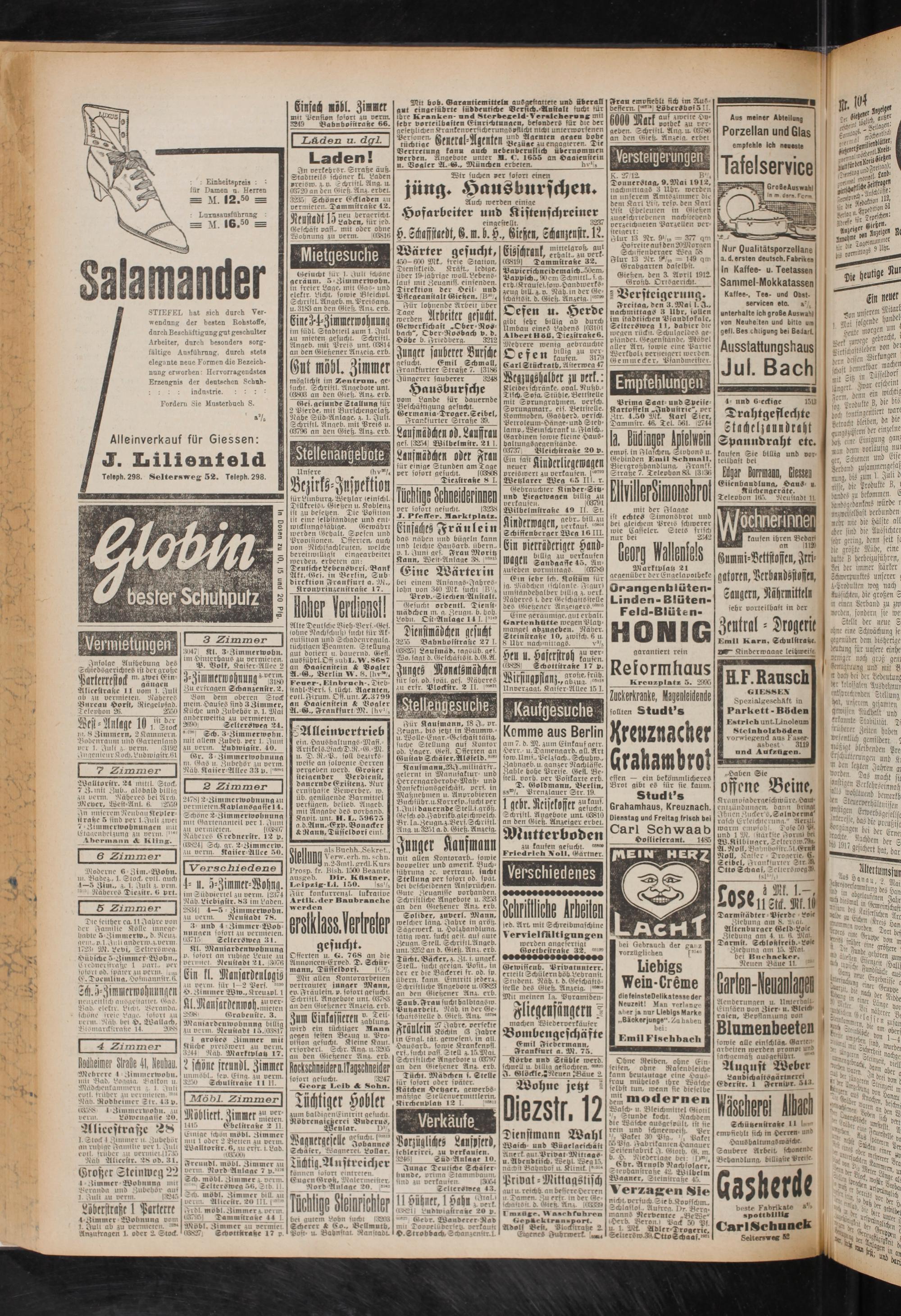 Solider, zuverl. Mann, welcher läng. Zähre in grötz. Sägewerk, u. Holzhandlung, tätig war. sucht geil, auf nute ,'jeugn. Stell. Schriftl.Angeb. unt.3252 an d. GieH. Anz. erb. Ducht. Bäcker, z. Zt. i. ungek. Stell., sucht geeign. Postt., in der er die Bäckerei fr. od. fv. übern, kann Eintritt jederz. Schriftliche Angebote u.03823 an den Giehener Anz. erb. Saub.Arau sucht halbtagSw. Puvarbeit. '.Nab. in der Ge schäftsstelle d. Gietz. Anz. om* Tränl-in 27Zähre, perfekte fiionilin Köchln (3 Zabre in (5ngl. tat gewesen», in all. Hansarb., sowie Krankenvsl. erf.sucht oass. Stell z.15.Mai. Schriftliche Angebote u 09797 an den (Hieüener Anz. erb.