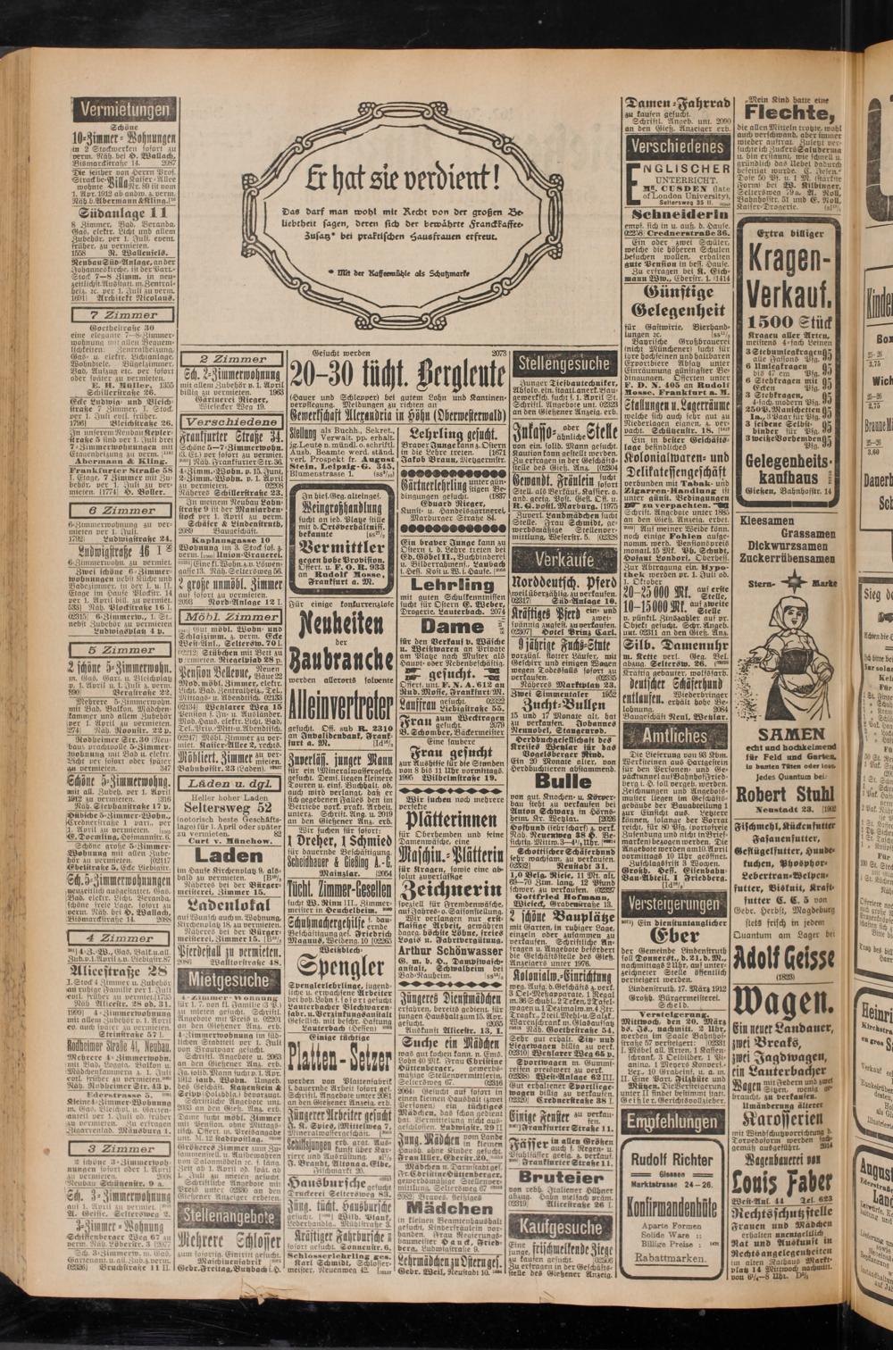 Schriftl. Angebote u. 2063 an den Giebener Anz. erb. Ja. wlid.8)tann sucht p. l.Avr. 1912 fand. Wobn. Umgeb, des Geschäft, ftatzcnftein * <Leivv!HolAhblg.l bevorzugt.