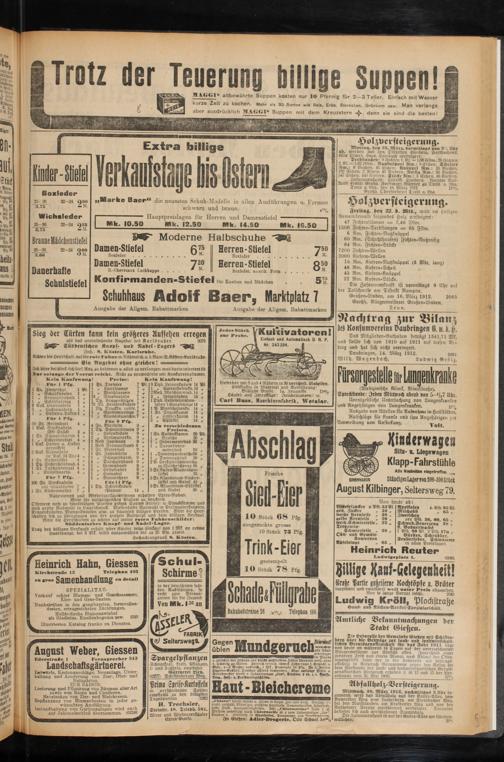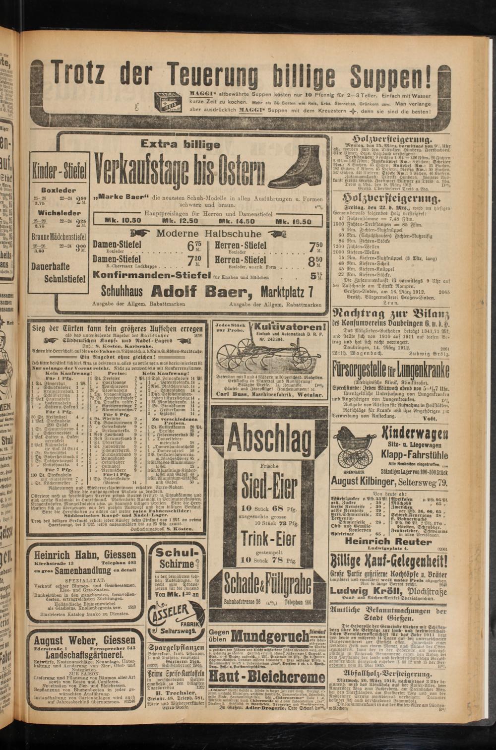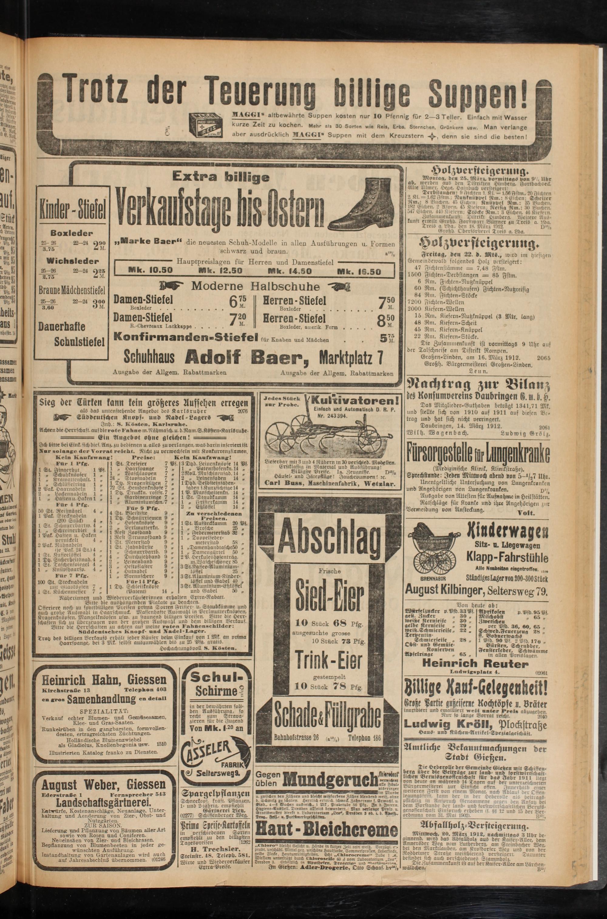 Mittwoch, SO. März 1912, nachmittags 3 llbr beginnend. wird das Abiallholz aus der Kaiier-Allee, dem Anneröder Weg oom Lutherberg, am Steinbacher Weg, ber den Marktlauben, am Krofdorier Weg und von der Rodheimer Straffe meistbietend versteigert, benndet nch auch verschiedenes Stammholz.