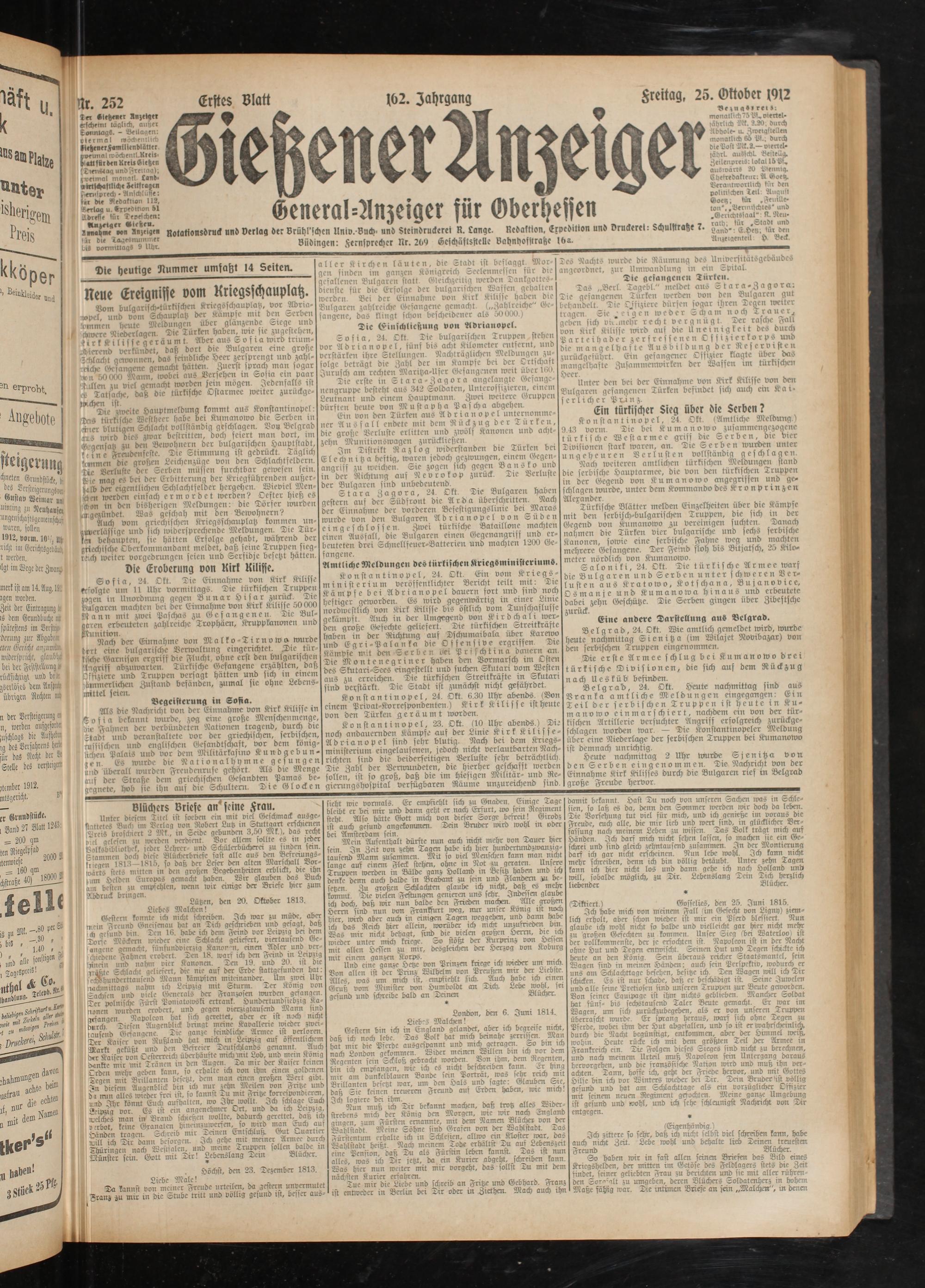 Stara Zagora, 24. Oki. Die Bulgaren haben gestern aus der Südfront die Arda überschritten. Nach der Einnahme der vorderen Befestigungslinie bei Maras wurde von den Bulgaren Adrianopel von Süden ein geschlossen. Zwei türkische Bataillone machten einen Ausfall, die Bulgaren einen Gegenangriff und erbeuteten drei Schnellfeuer-Batterien und machten 1200 Gefangene.