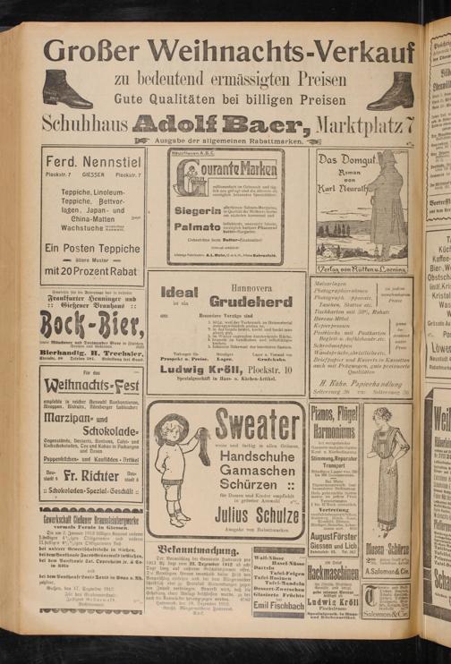 D>e am 2. Januar 1913 fälligen Kupons unserer I.stelligen 4%igeu Obligationen und unserer Il.stelligen 41/2%igcn Obltgaiioncn sind bei unserer Gcwcrtschaftskasse in Gießen, bei demBankhansc FacobGriincmald inGicßen, bei dem Bankhausc Zat. Oppenheim jr. & Co- in