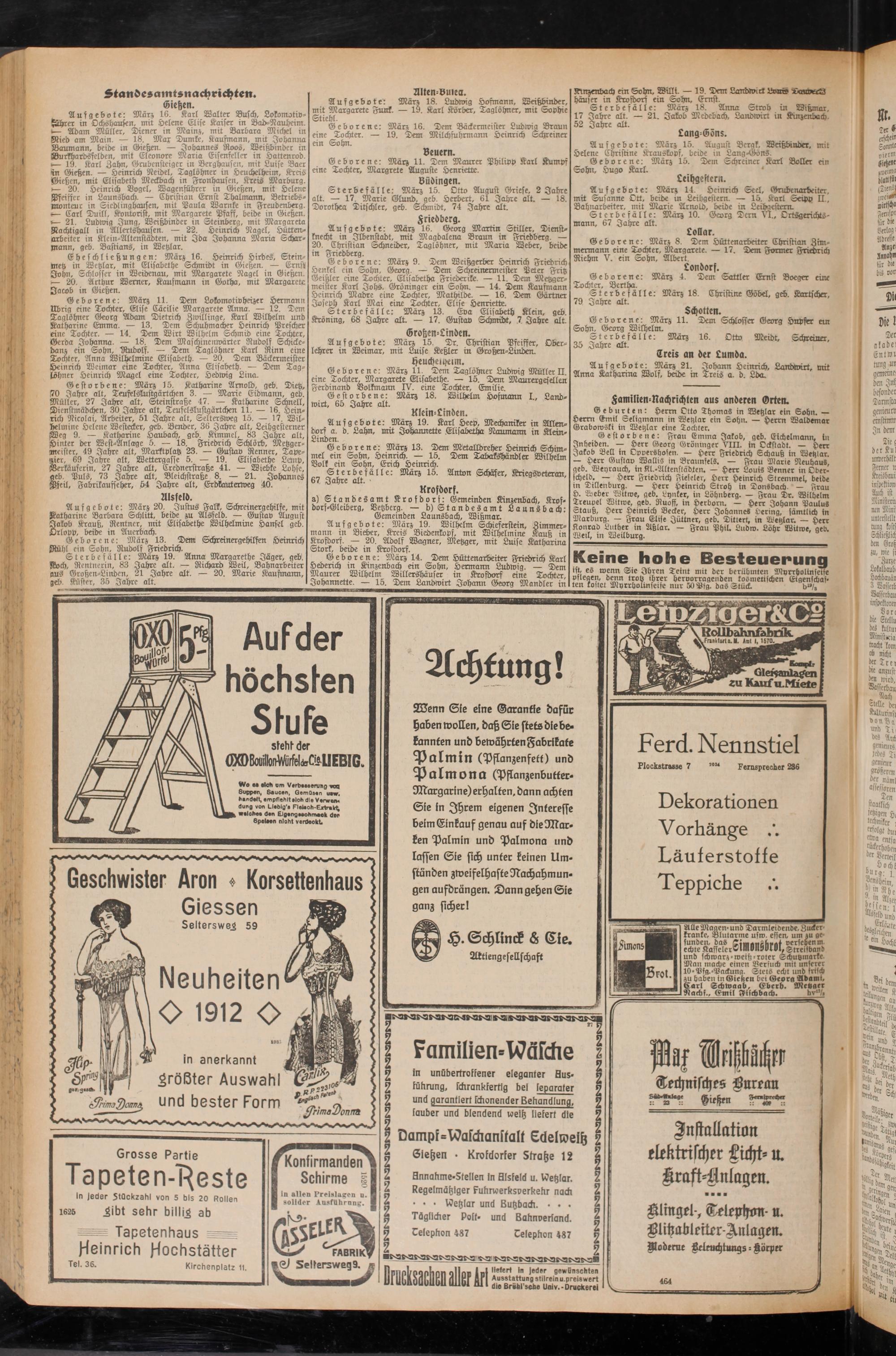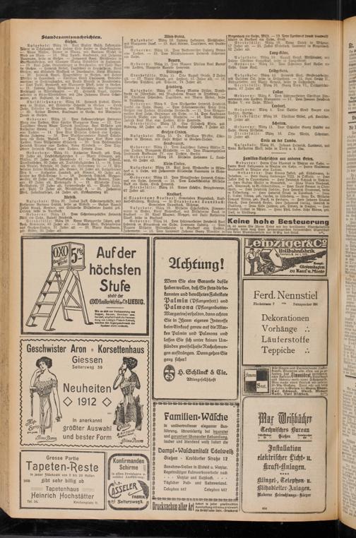 Geburten: Herrn Otto Thomas in Wetzlar ein Sohn. — Herrn Emil Seligmann in Wetzlar ein Sohn. — Herrn Waldemar Grabowski in Wetzlar eine Tochter.