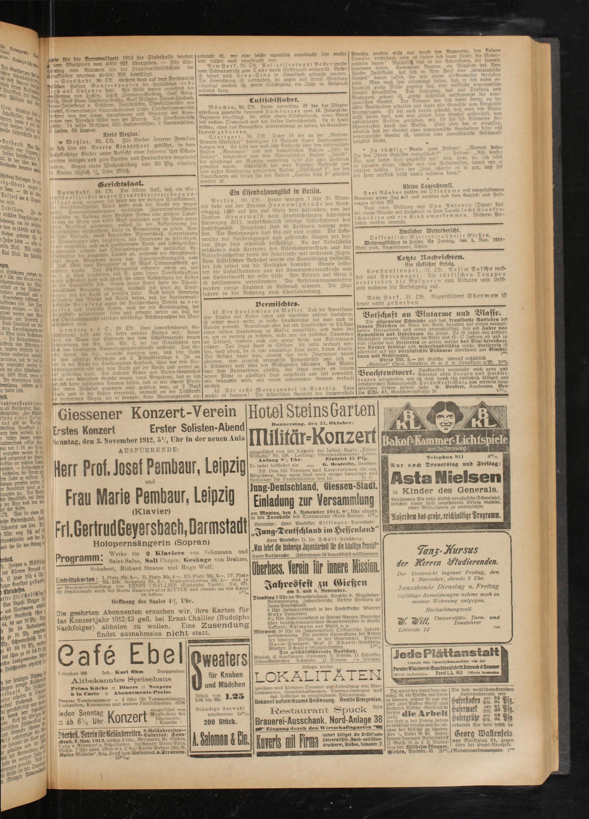 Giessener Konzert-Verein Hotel Steins Garten mMß Erstes Konzert Erster Solisten-Abend — v'~nvi jßÄÄt