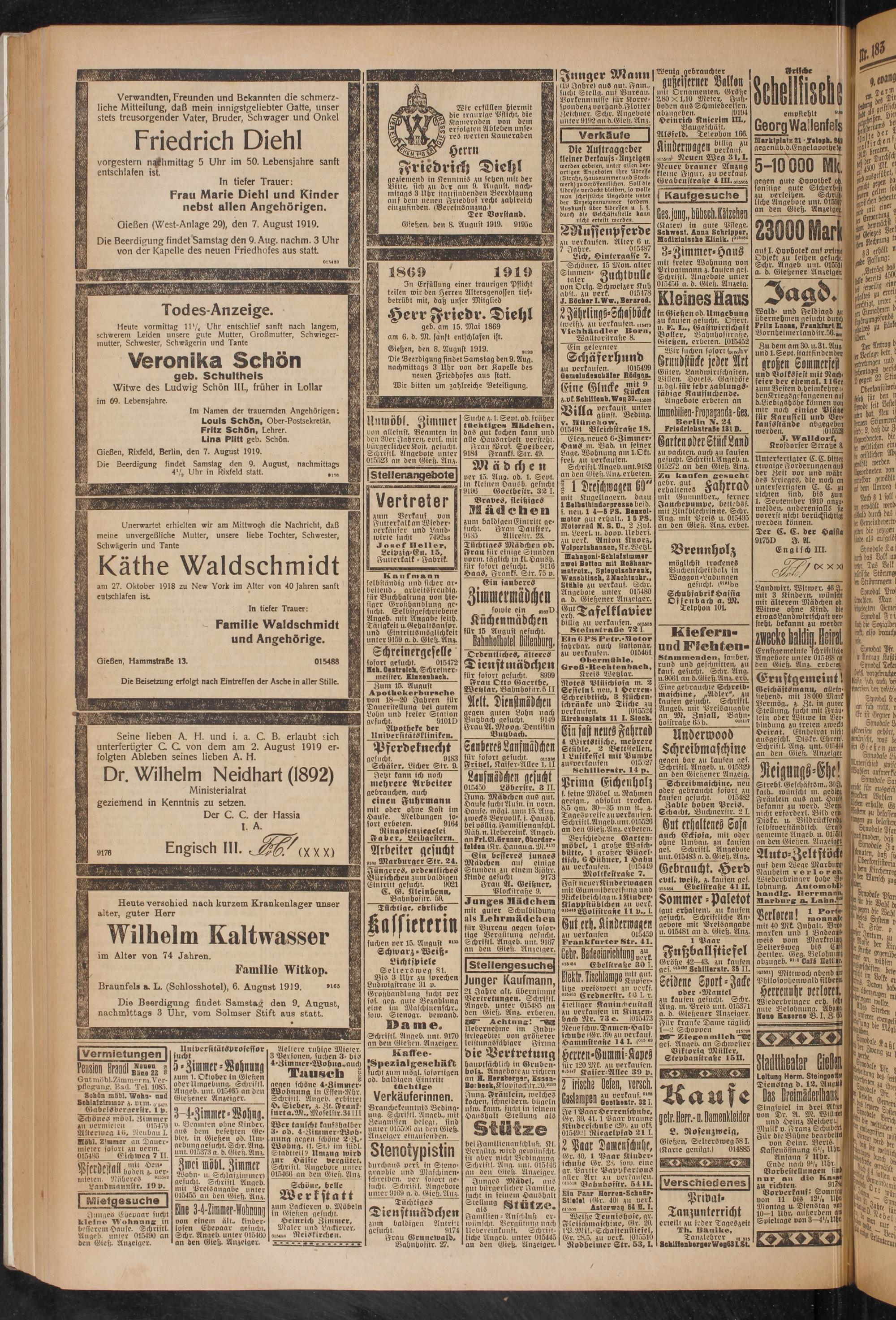 Friedrich Diehl geziemend in Kenntnis zu setzen mit der Bitte, sich zn der am 9. August, nach- mitagS 3 Uhr stattsindenden Beerdigung auf dem neuen Friedhof recht zahlreich eiuzufinden. lBereinSanzug.)