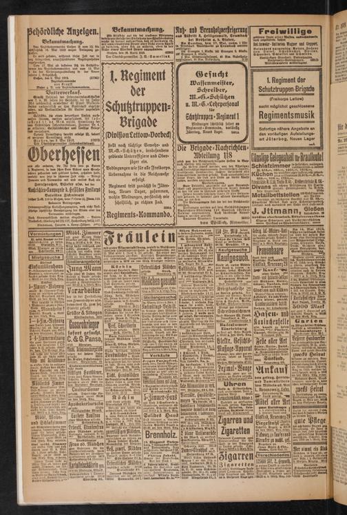 Ter Oberbürgermeister (LebenSmittelamt). Oberhessen und eie eroberen, Ne Ihr stet» treu zu Eurem 2. Regiment, in dem schon Eure Däter und Srost» Väter gestanden und geblutet haben, gehalten habt, verlaßt un» jetzt In schwerer Zeit nicht. - Bringt Freunde und Verwandte mit und meldet Euch als Fernsprecher, ©Unter usw. bei der MWtHtsimiüt 6. öMcn grtiforjä Bataillon Zickendraht