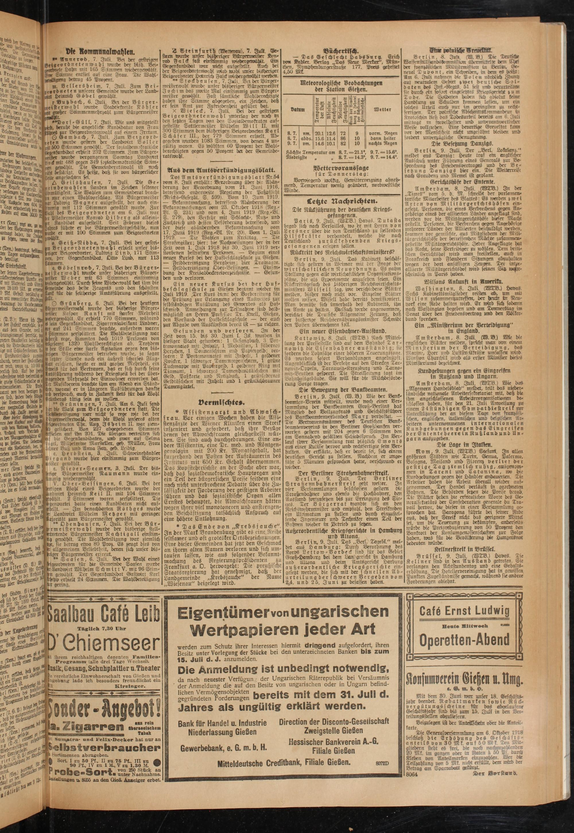 Dos Amtsverkündigungsblatt Nr.54 vom 8. Juli enthält: Verordnung über bic Abän- bmmg der Verordnung vom 21. Juni 1916, betreffend anderweite Regelung der Paßpflickt (Rcicks-Gcsetzbl. S. 599). Vom 10. Jun, 1919. — Bekanntmachung, betreffend Abänderung der Bckanntmechungen ovm 23. Oktober 1918 (Reg.- Bl. S. 231) und vom 4. Juni 1919 (Reg.-Bl. S. 279), den Verkehr mit Schlacht-, Rutz- und Zuchtvieh und brifen Beförderung betreffend, und der diese abändernden Bekanntmachung oom 17. Juni 1919 (Reg.-Bl. Nr. 20). Vom 1. Juli 1919. — Tie Wahlen zum Kreistag. — Tie Strafregister; hier: die Nachweisungen der in der Zeit vom 1. Julr 1918 bis 30. Juni 1919 verstorbenen bestraften Perstmen. — Beginn eines neuen Kurses bei der Hufbeschlagschule zu Gießen. — Feldbereinigung Bergheim: lner Tramagm. — Feld Vereinigung Ober-Bessingen. — Einsrn- dung der Kreisabdeckereiverzeichnisse. — Gefunden und verloren.