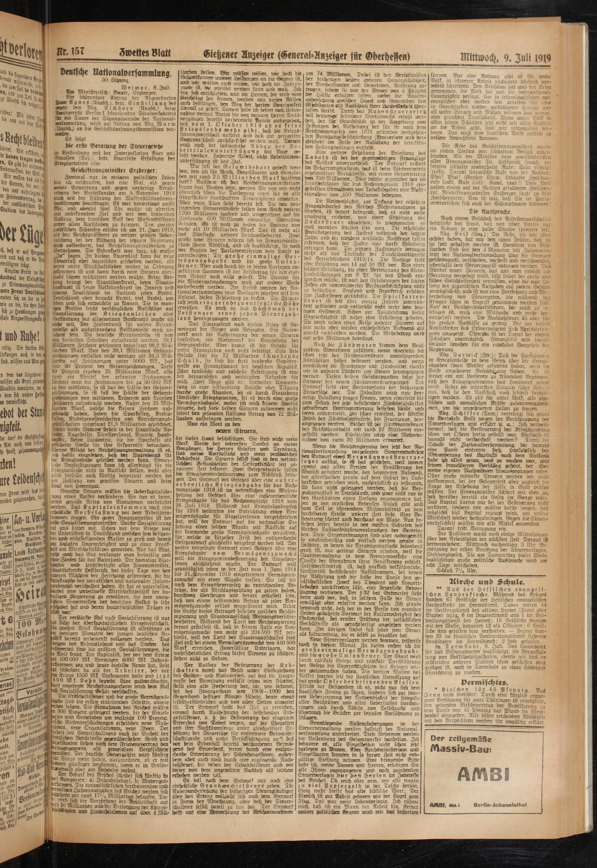 Das Finanzelend nach diesem Krieg ist Gemeingut der Sieger und Besiegten. Ein Riesenwerk wird die Aufbringung der neuen Steuern darstellen, ein Riesenwerk die Verzinsung der Kriegsanleihe. Aber damit ist die Gefahr für unser Finanzleben noch nicht beseitigt. Eine stete Gefahr sind die 72 Milliarden schwebende Schuld, sie sind die stets drohende Gewitterwolke am Finanzhimmel der deutschen Republik. Ihre tunlichste unb rascheste Beseitigung ist eine der dringendsten und wichtigsten Aufgaben für mich. Zwei Wege gibt es: Entweder Umwandlung in eine festsundierte Anleihe oder Tilgung durche große Abgaben, sei es durch Einziehung sämtlicher Kriegsgewinne, sei es durch eine große Vermögensabgabe, wobei ich mich keinem Zweifel hingebe, daß diese beiden Steuern zusammen nicht sofort den gesamten flüssigen Bettag von 72 Milliarden aufbringen werden.