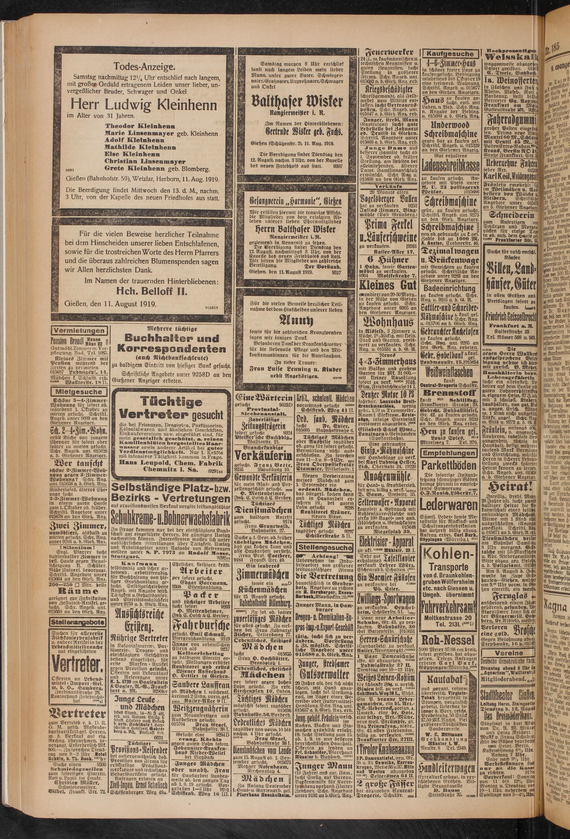Schr. Aug. unt. 9285 an den Gieh. Anz. erbeten.