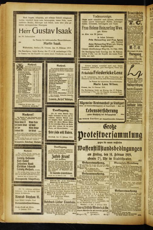 Giessen (Schiffenberger Weg 63), 13. Febr. 1919. Die Beerdigung findet Sonntag den 16. Februar, nachm. 3 Uhr, von der Kapelle des neuen Friedhofes aus statt oq®r