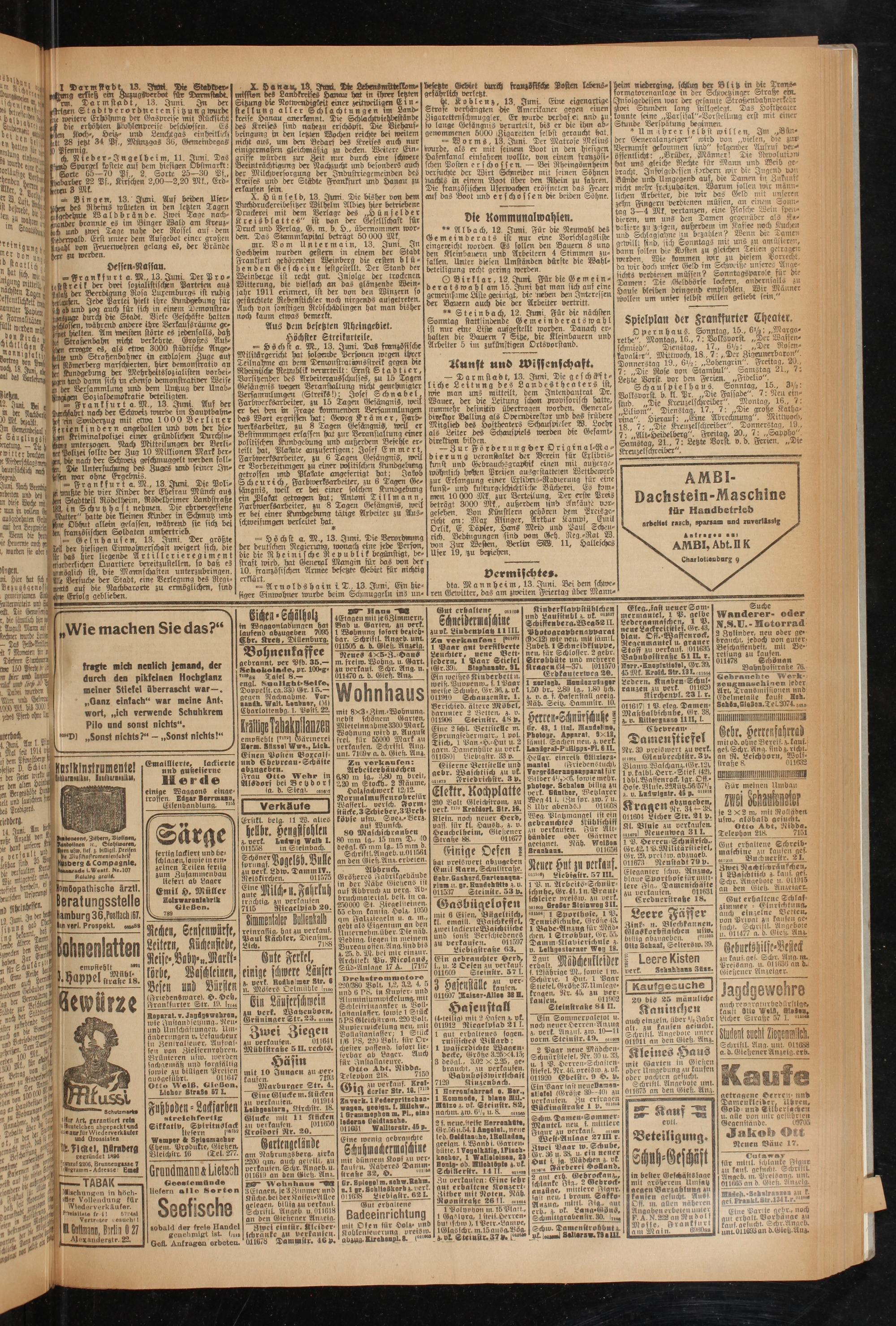 = Frankfurt a. M., 13. Juni. Die Poli- lti mußte die vier Kinder der Ehesrau Münch aus m diese Botte mit dem Stadtteil Rödelheim, Rödelheimer Landsttaße i mm in ttott 183, in Schutzh ast nehmen Die Awergessene auäqcbebnten „Mtter" lmtte die Heinen Kultur m Schmutz und aui ten SerattiS- Obhut allein gelassen, während sie sich bei Xr J kn ftanzösischen Soldaten umhertrieb iebStkmK ]= Gelnhausen, 13. Juni. Ter^.größte । mürben sie Sen Teil der hiesigen Einwohnerschaft weigert sich, bte 1, rourten |ie aten. Artillerieregiment