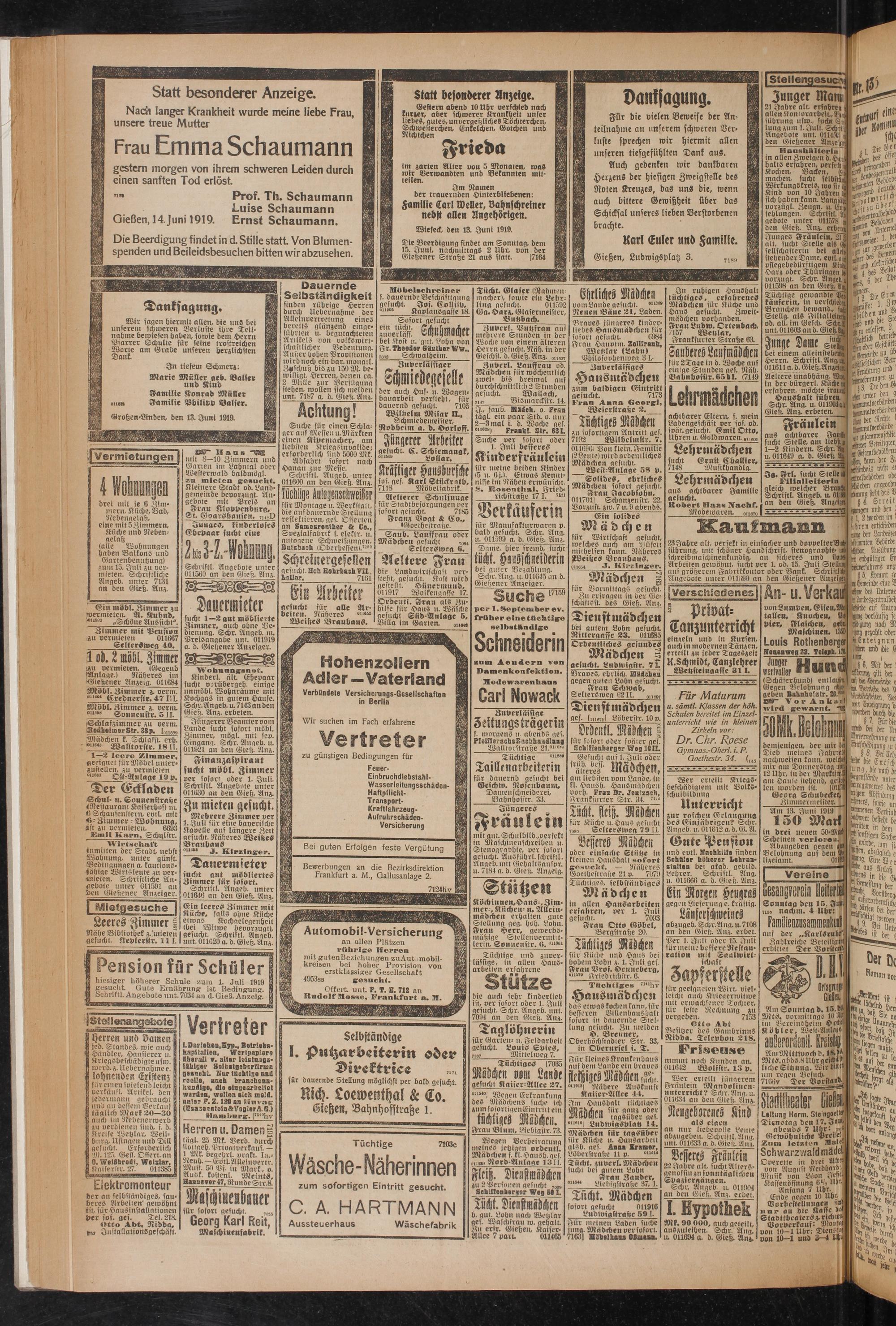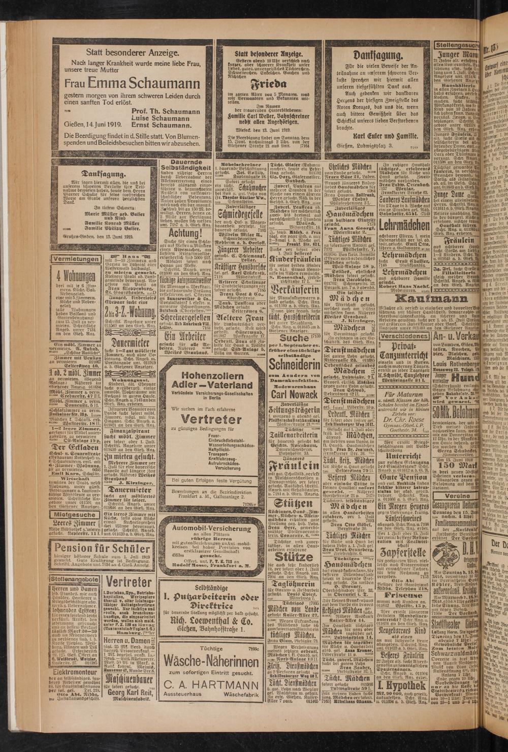 Pension für Schüler hiesiger höherer Schule zum 1. Juli 1919 gesucht Gute Ernährung ist Bedingung, bchnftl. Angebote unt. 7034 an d. Gieß. Anzeig.