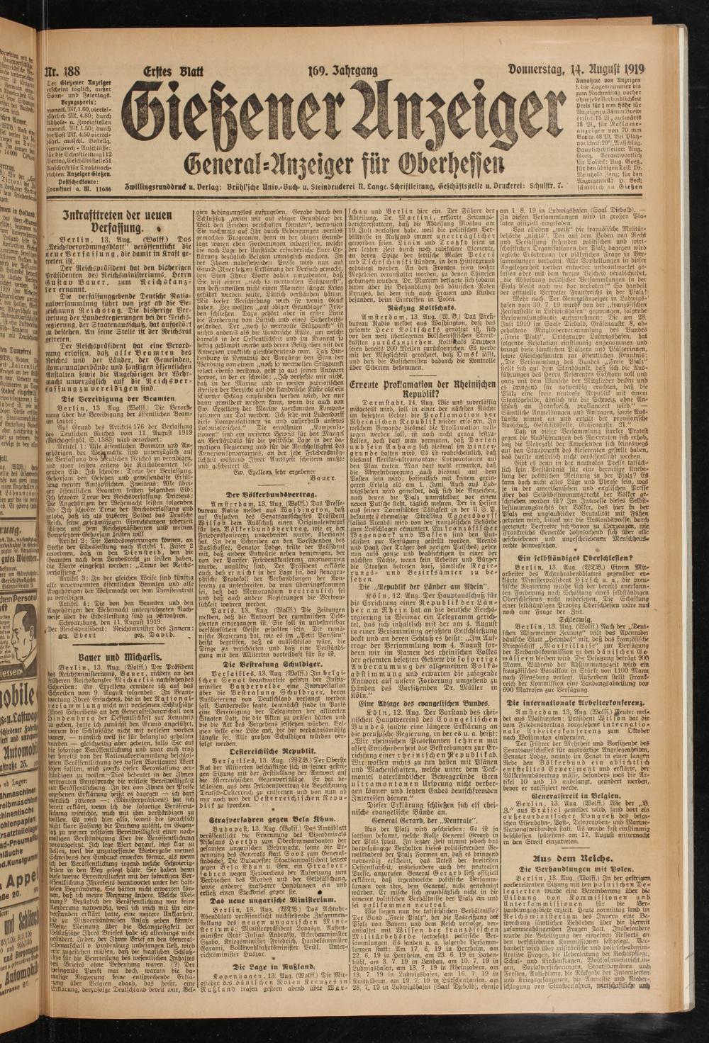 Annahme von Anzeigen s. die Zaflesnummer vts zum Rachmiltag vorher ohne jedeVerbiiidlichkett Preis für 1 mm höhe für Anzeigen v.34iumBreite örtli i) 15 Pf., auswärts 18 Pi., für Reklame- anzeigen von 70 mm Breite 48 Pf. Bei Platz- vorschriii20°/., Aufschlag. HauptjchriiUeiler: Ang. Goeg. Lerantivortlich für Politik: Ang. Goetz, für den übrigen Teil: Dr. Reinhold Zenz; für den Anzeigenteil: v- Beck; sämtllch ui Gießen