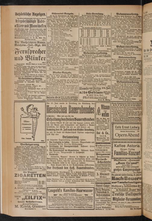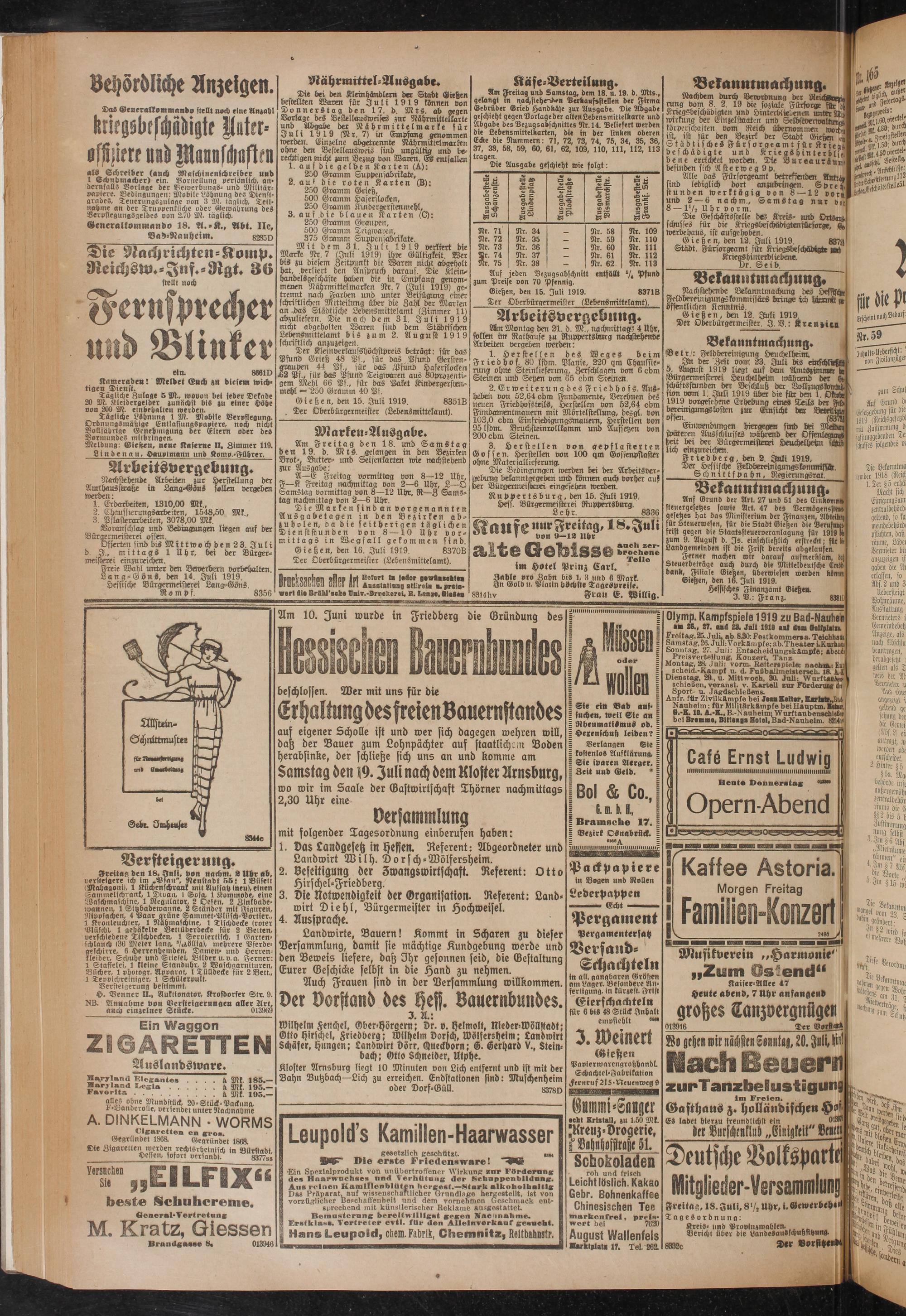 Die bei den Kleinhändlern der Stadt Gießen bestellten Waren für Juli 1919 können von Donnerstag den 17. d. Mts. ab gegen Vorlage des Beflellausweis^ zur Nährmittelkarte und Abgabe der Nährmittelmarke für Juli 1919 (Nr. 7) in Empfang genommen werden. Einzelne abgetrcnnde Nährmittesmarken ohne den Bestellausweis sind ungültig und berechtigen nicht zum Bezug von Waren. Es entfallen