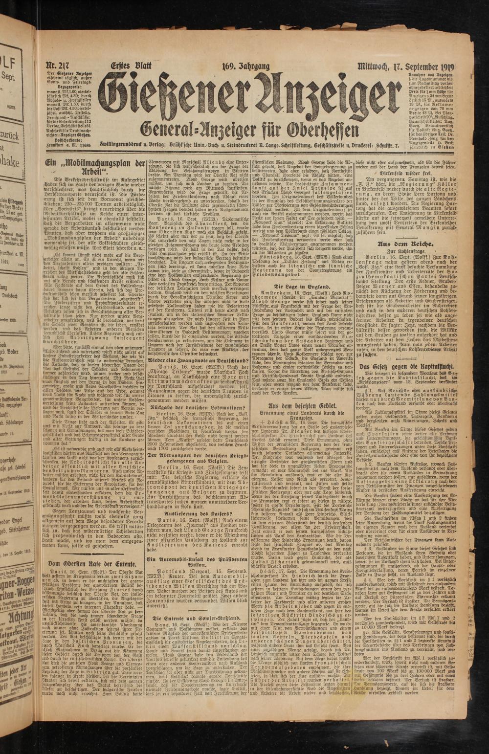 Annahme von Anzeigen f. die Lagesnummer bt5 zum Nachmittag vorher ohnejedeVerbindlichkeit Stets für 1 mm höhe für ureigen v.34mmBreUe örtlich 15 Pf., auSivärts 18 Pf., für Neklame- an zeigeu von 70 mm Breite 48 Ps. Bei Plah- vorfchriil20°/gAufschlag„ Hauotschriitleiter: Aug. Goetz. Verantwortlich für Politik: Aug. Goetz, für den übrigen Teil: Dr. Reinhold Zenz; für ben AuzeigenteU: H. Beck; sämtlich tu Gießer»