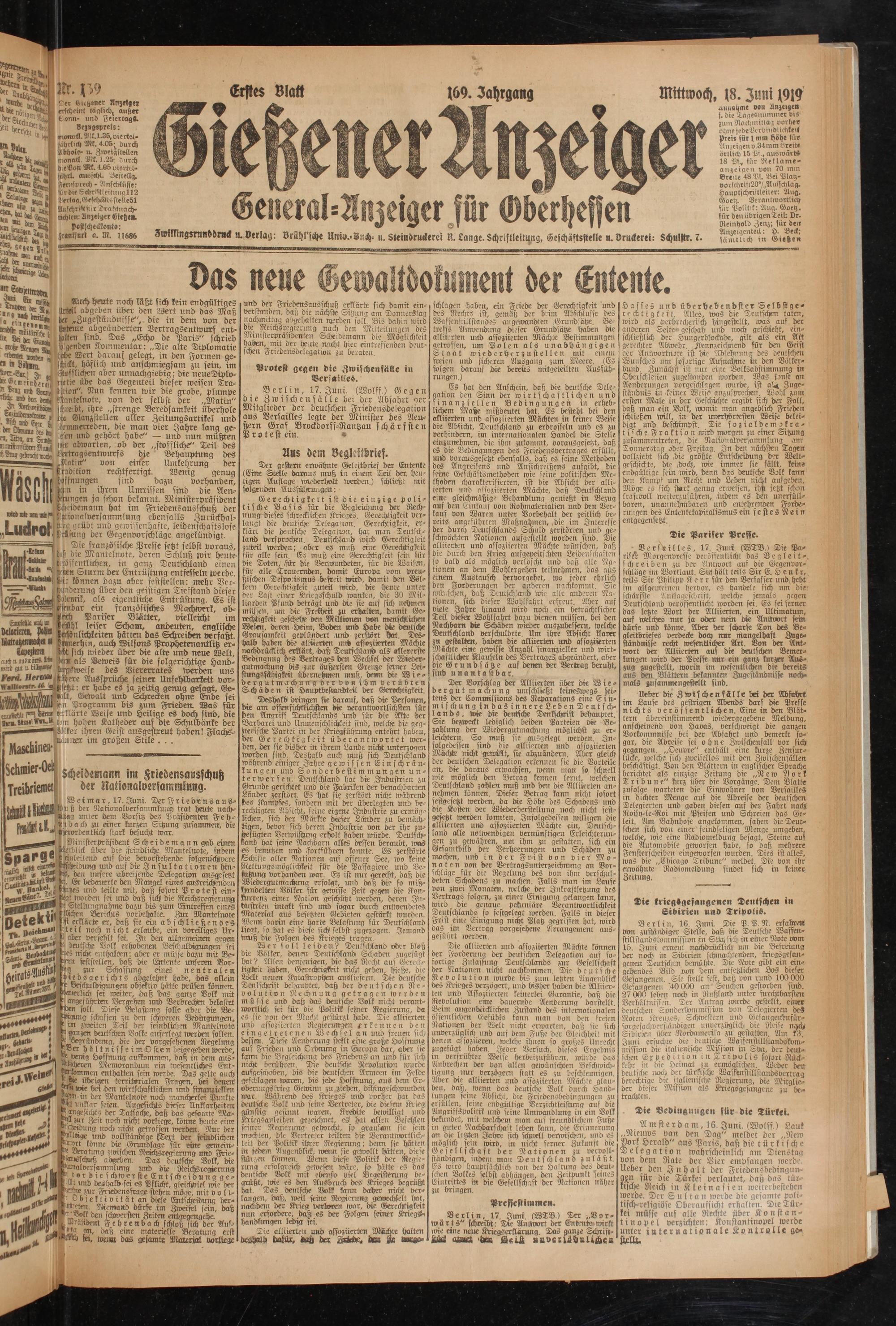 tiHiiaqmt von Unzetgea s. die iagesnummer bis1 zum Nachmittag vorher ohnejedeVcrbindtichkerß preis för \ mm höhe für Anzeigen o 34mm Breite örtlich 15 Pi., ausivärtA 18 Pf., für Reklameanzeigen von 70 mm Breite 48 Pf. Bei Platz- vorschriii20°/,Auischlag. Hauptschriitleiter: Ang. Goetz. Berantwortlicy für Politik: Ang. Goetz, für den übrigen Teil: Dr. Neinhold Zenz; für den Anzeigenteü: p. Beck; sämtlich in Gießen